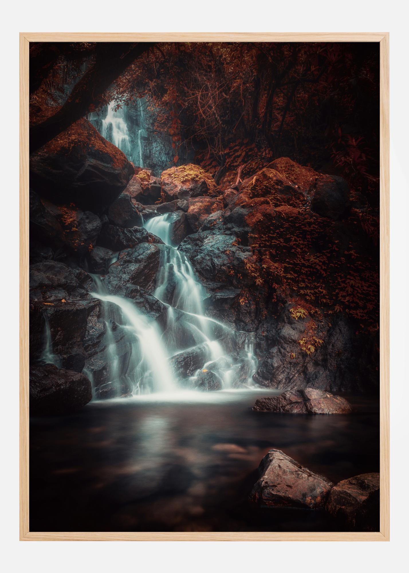 Ein Fantasy-Poster eines magischen Wasserfalls inmitten von rotem Moos und roten Bäumen. Die dunkle Natur dieses Bildes trägt dazu bei, eine magische Atmosphäre zu schaffen, in deren Mittelpunkt der helle weiße Wasserfall steht. Reisen Sie mit diesem Bild in Ihren eigenen Garten Eden.