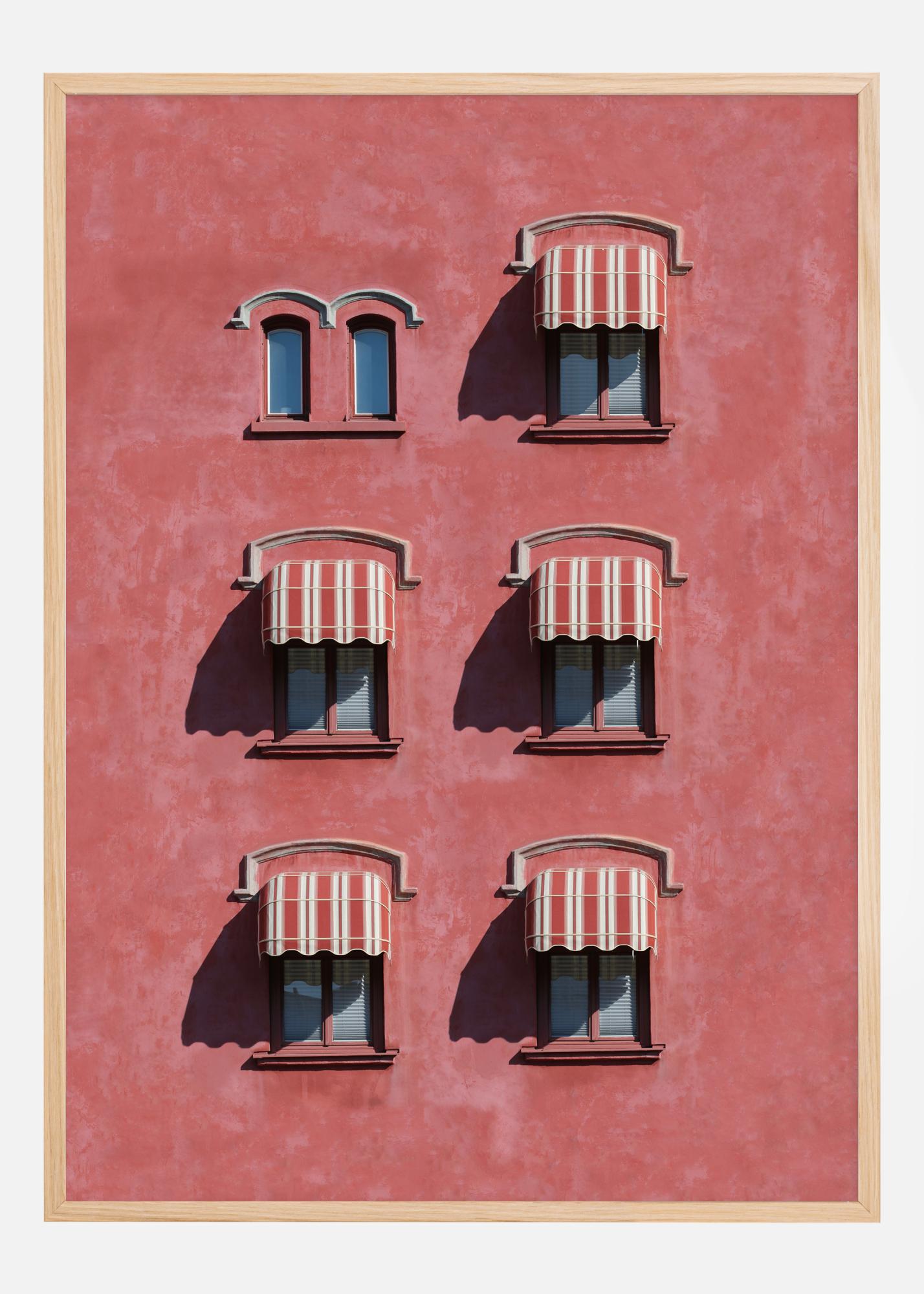 Dieses elegante und anspruchsvolle Poster, "Red Wall", zeigt architektonische Harmonie und visuelles Gleichgewicht. Sechs Fenster, jedes mit einer markanten Markise, zieren die lebendige rote Fassade und verleihen eine rhythmische Symmetrie, die sowohl beruhigend als auch befriedigend für das Auge ist. Das spielerische Spiel der Sonne über der Oberfläche erweckt die Struktur zum Leben und schafft ein Spiel zwischen Licht und Schatten.
