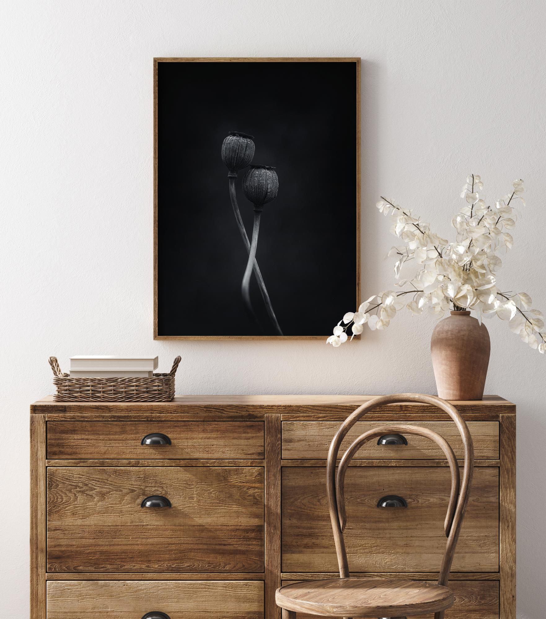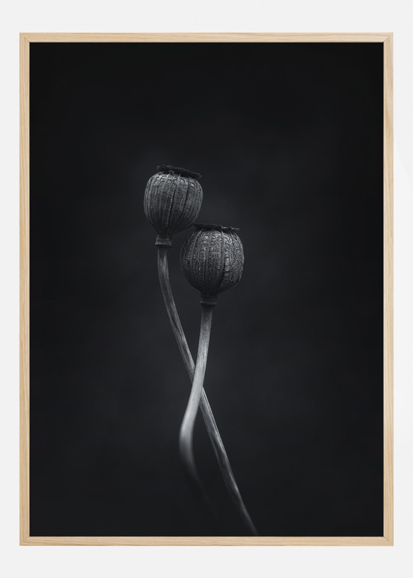 Ein detailliertes Naturposter mit zwei ineinander verschlungenen Mohnköpfen. Diese malerisch anmutende Aufnahme erweckt das Gefühl von zwei Tänzern. Spüren Sie die Liebe und Eleganz, wenn Sie dieses Poster bei sich zu Hause aufhängen.