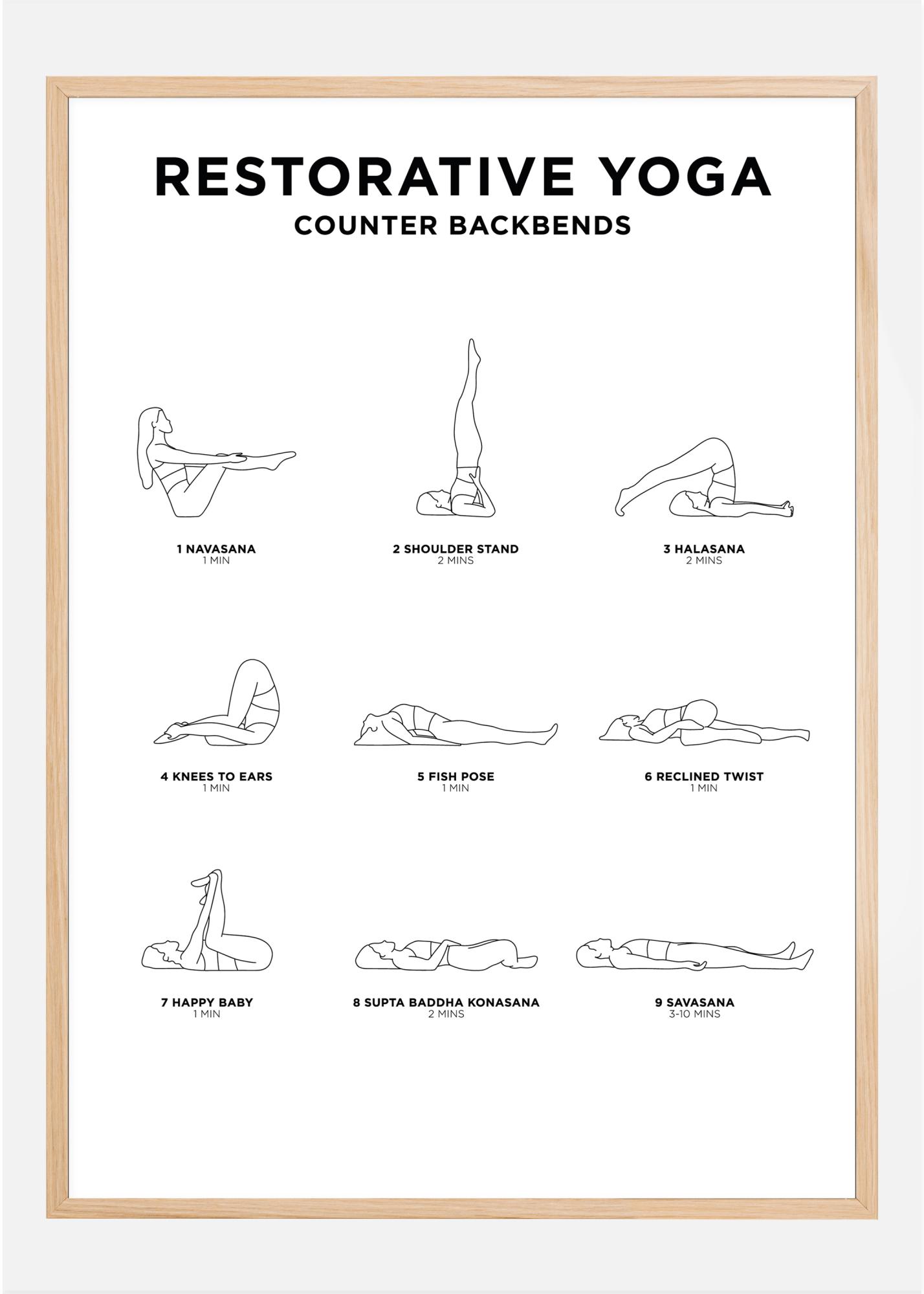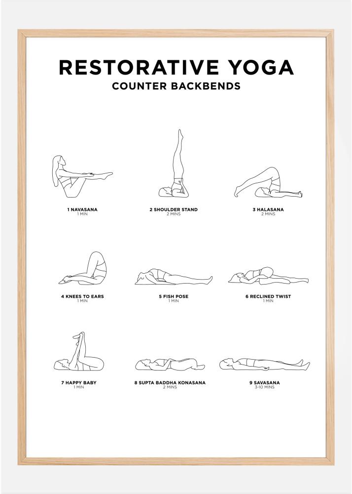Lerne dich zu entspannen mit Restorative Yoga. Dieses stilvolle Poster ist nicht nur ein schicker Einrichtungsdetail, es gibt dir auch konkrete Anweisungen für Positionen innerhalb dieses entspannenden Yoga-Stils. Trendiges Poster, das vorteilhaft mit anderen Motiven kombiniert werden kann, um eine trendige Bildwand zu schaffen.