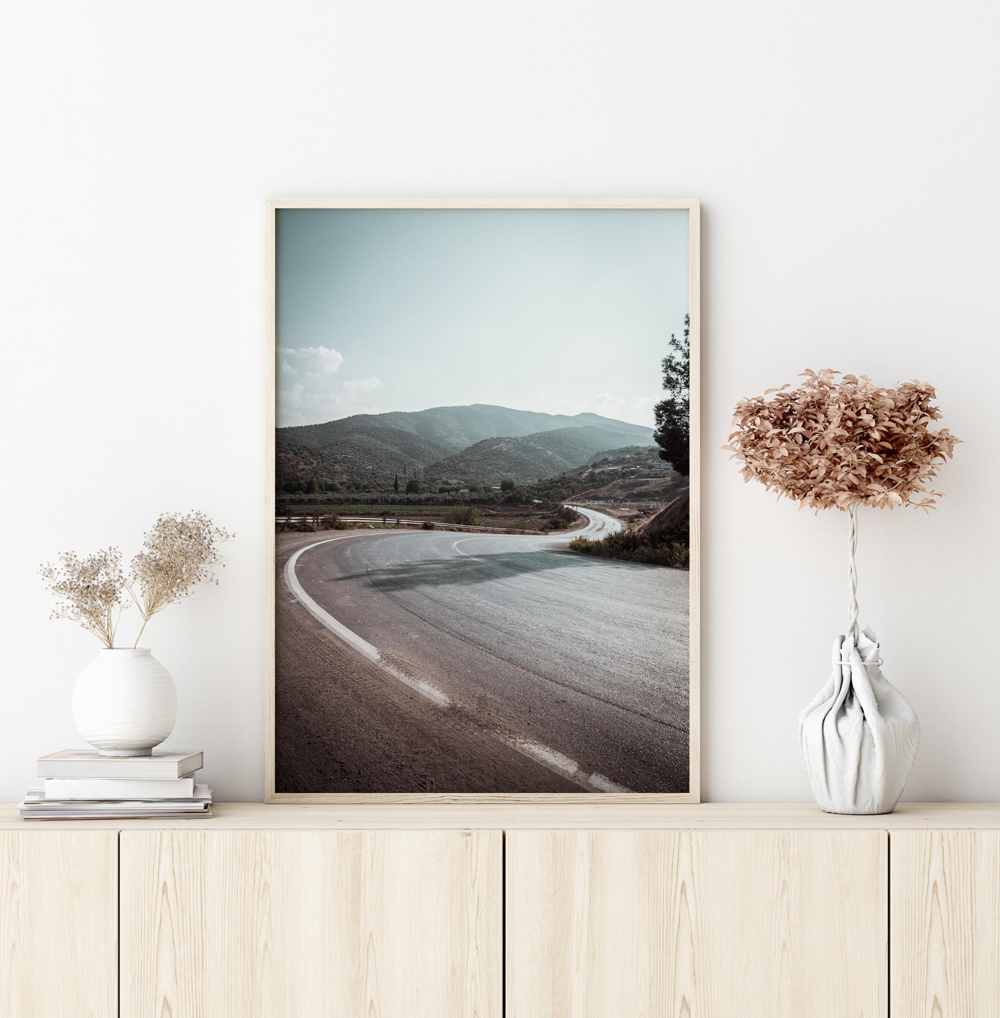 Ein landschaftliches Poster einer Straße, die sich durch die Berge schlängelt. Eine einzige asphaltierte Straße windet sich in der Ferne zu den fernen Berggipfeln. Die Farben sind sanft und erinnern an einen Frühlingstag, an dem man mit offenem Verdeck fährt. Holen Sie sich dieses Gefühl der Leichtigkeit mit diesem Poster.