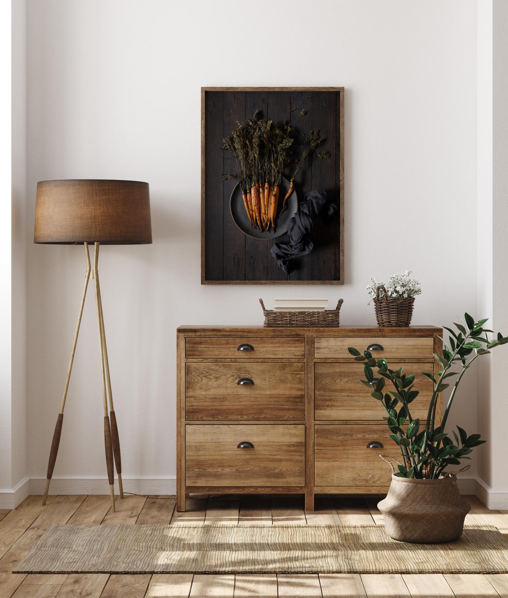 Ein kulinarisches Poster mit einem Bündel frisch gepflückter Karotten auf einem dunkelblauen Teller. Die orangefarbenen Karotten leuchten förmlich, während sie auf dem marineblauen Teller mit dem dunklen Holz dahinter liegen. Die welkenden Blätter zeigen an, dass die Karotten zum Verzehr bereit sind. Bringen Sie dieses Bild in Ihre Küche und sorgen Sie für eine lustige Foodie-Atmosphäre.
