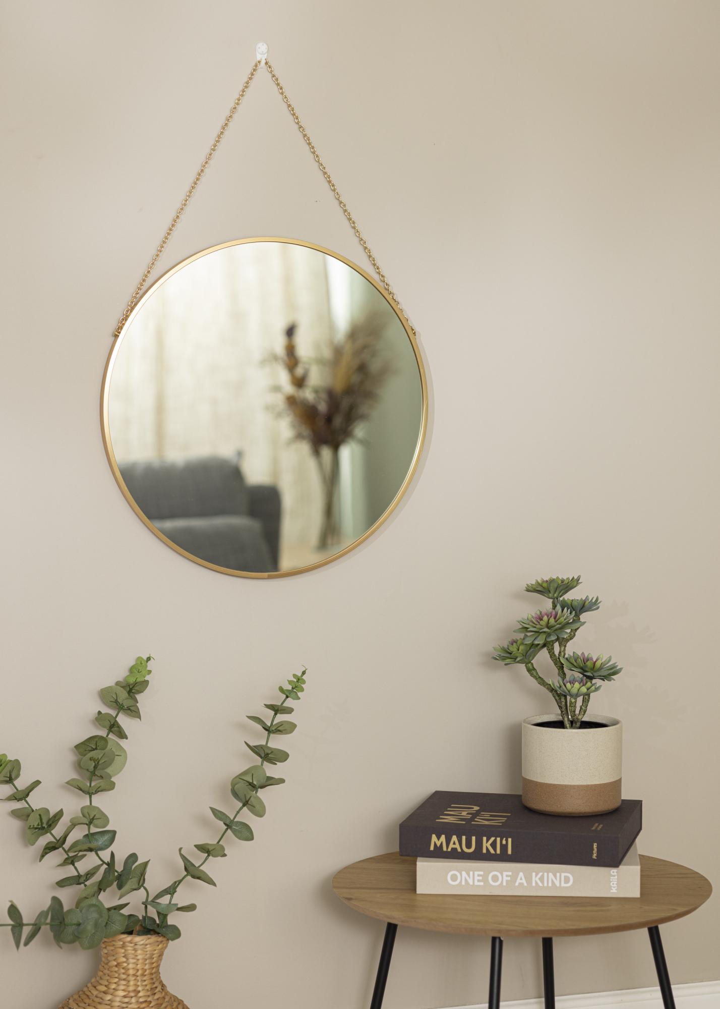 Ein runder Wandspiegel, der Funktion und Eleganz perfekt kombiniert. Der Spiegel zeichnet sich durch sein stilvolles Design mit klassisch runder Form und dem 28 mm tiefen Rahmen in elegantem Goldton aus. Die schöne Formgebung dieses Spiegels wird mit der goldfarbenen Kette für die Aufhängung an der Wand überaus stilsicher zur Vollendung gebracht.