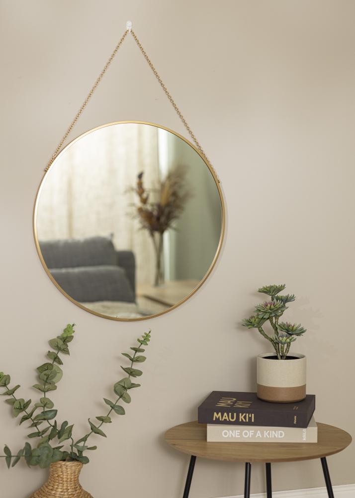 Ein runder Wandspiegel, der Funktion und Eleganz perfekt kombiniert. Der Spiegel zeichnet sich durch sein stilvolles Design mit klassisch runder Form und dem 28 mm tiefen Rahmen in elegantem Goldton aus. Die schöne Formgebung dieses Spiegels wird mit der goldfarbenen Kette für die Aufhängung an der Wand überaus stilsicher zur Vollendung gebracht.