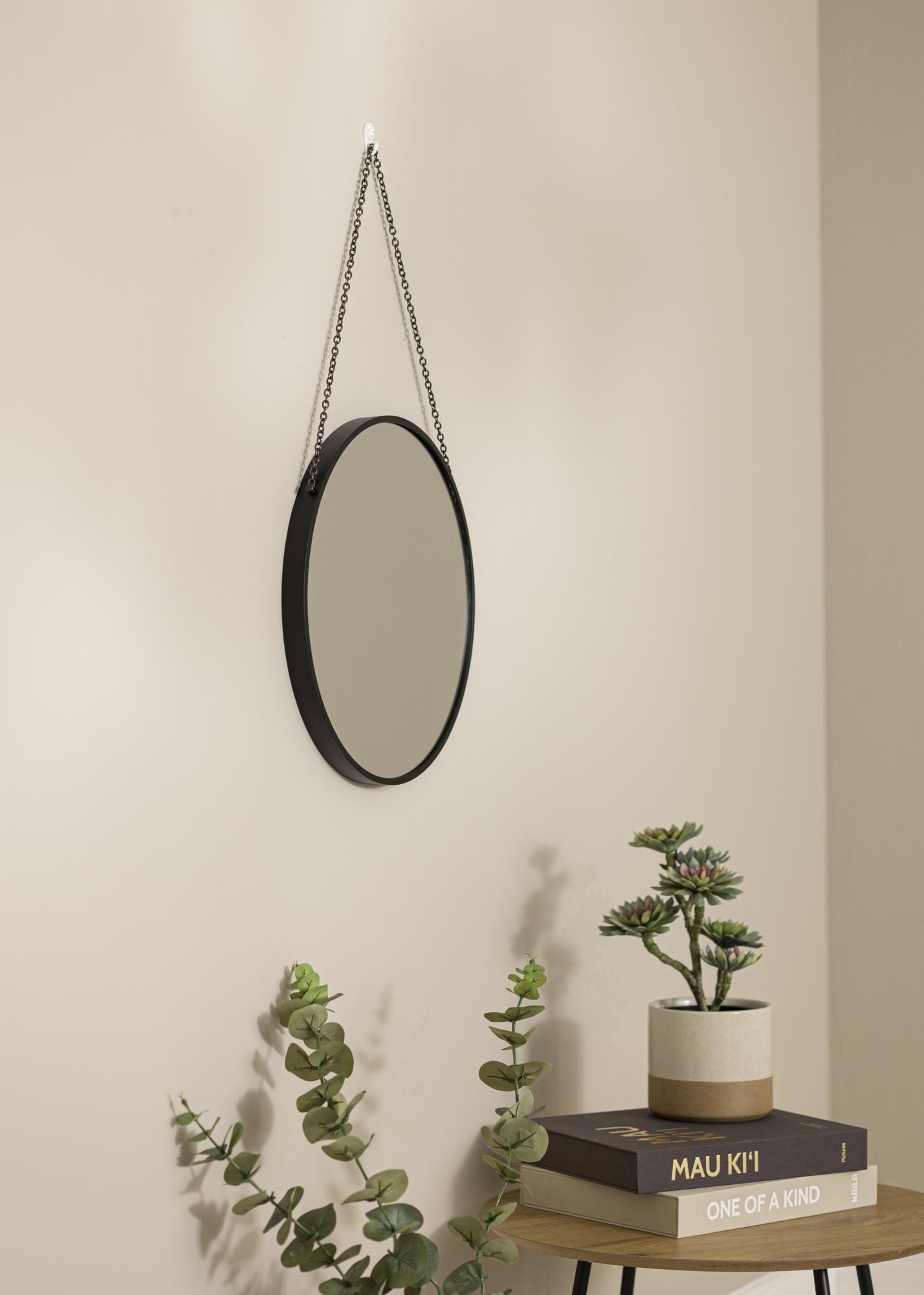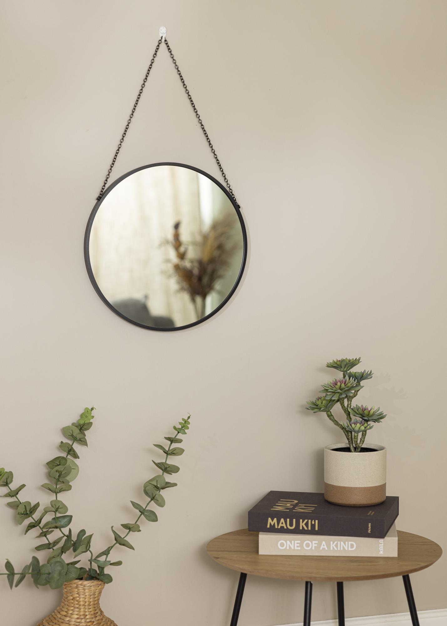 Ein runder Spiegel gilt als Klassiker und das aus gutem Grund! Die weiche Form wirkt sehr elegant und bricht die in vielen Einrichtungen vorherrschende Geradlinigkeit. Dieser runde Wohnspiegel zeichnet sich durch einen 28 mm tiefen Rahmen in stilsicherer schwarzer Farbgebung aus, die sich mit anderen Wohnaccessoires und vielen Wohnstilen kombinieren lässt. Der Rahmen des Spiegels ist aus Metall gefertigt. Der Spiegel wird mit einer schwarzen Kette aufgehängt, wodurch der Ausdruck von Eleganz zusätzlich verstärkt wird.