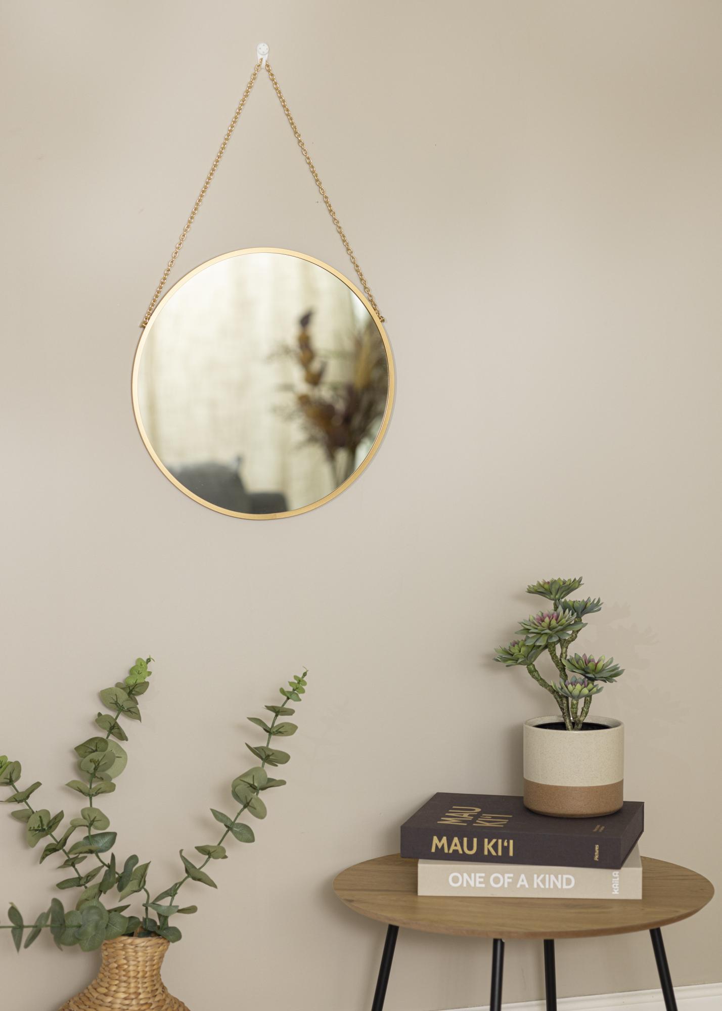 Dieser Wohnspiegel verleiht deinem Zuhause einen Hauch Eleganz! Der Spiegel wirkt mit seiner klassisch runden Form und dem schmalen Spiegelrahmen mit einer Tiefe von nur 8 mm ausgesprochen ausgewogen und formvollendet. Der hübsche Rahmen ist aus Metall gefertigt und in einem exklusiven Goldton gehalten. Der elegante Charakter dieses ansprechenden Wohnspiegels wird durch die goldfarbene Kettenaufhängung zusätzlich verstärkt.