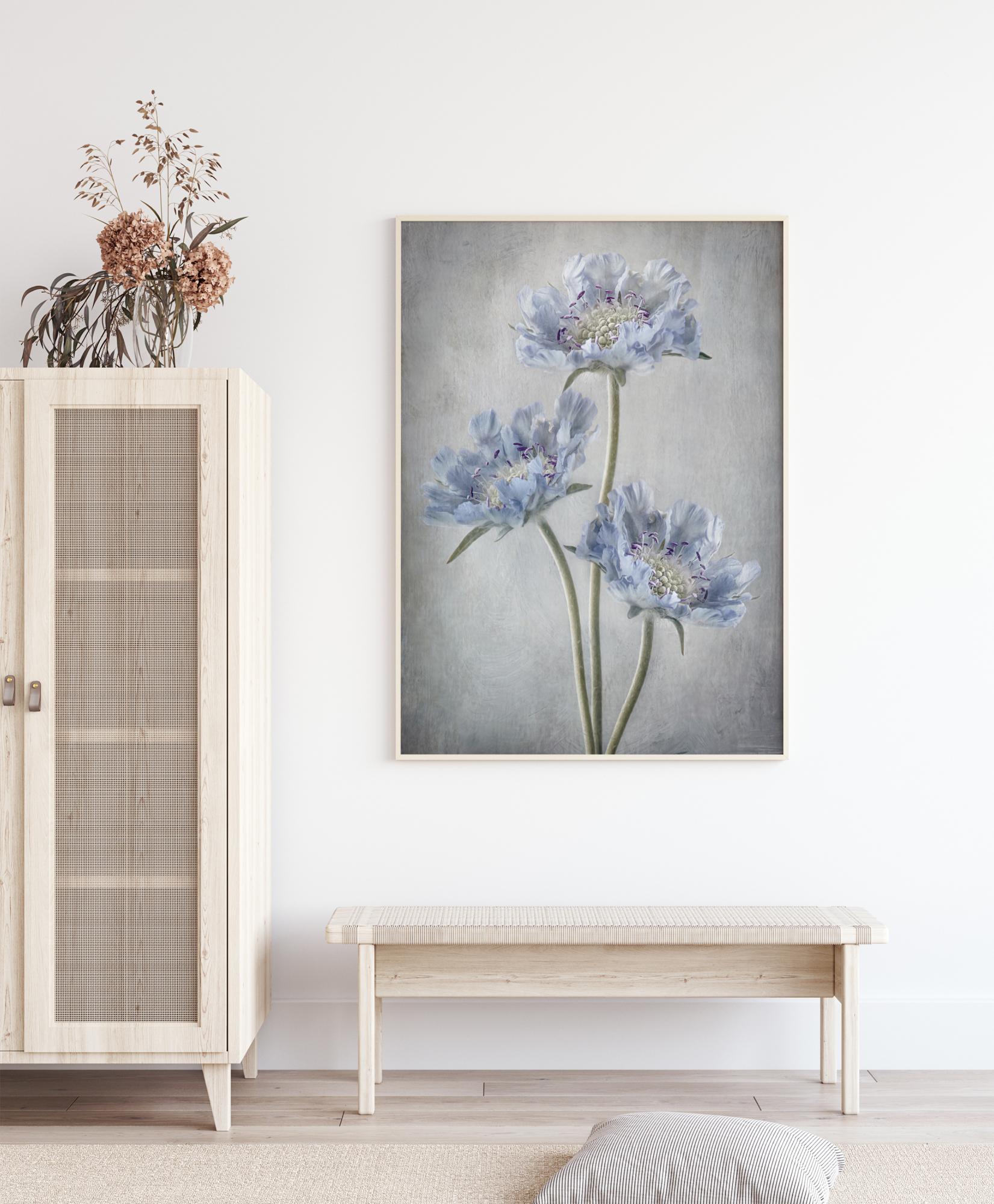 Ein ätherisches Poster mit drei Scabiosa-Blüten vor einer sanften, hellblauen Wand. Die herrlichen blauen Blütenblätter kräuseln sich auf diesem atemberaubenden Gemälde nach oben. Die Blumen werden durch den helleren weißen Hintergrund beleuchtet und heben sich dadurch hervor. Wachen Sie mit diesem friedlichen Stillleben in Ihrem Schlafzimmer auf.