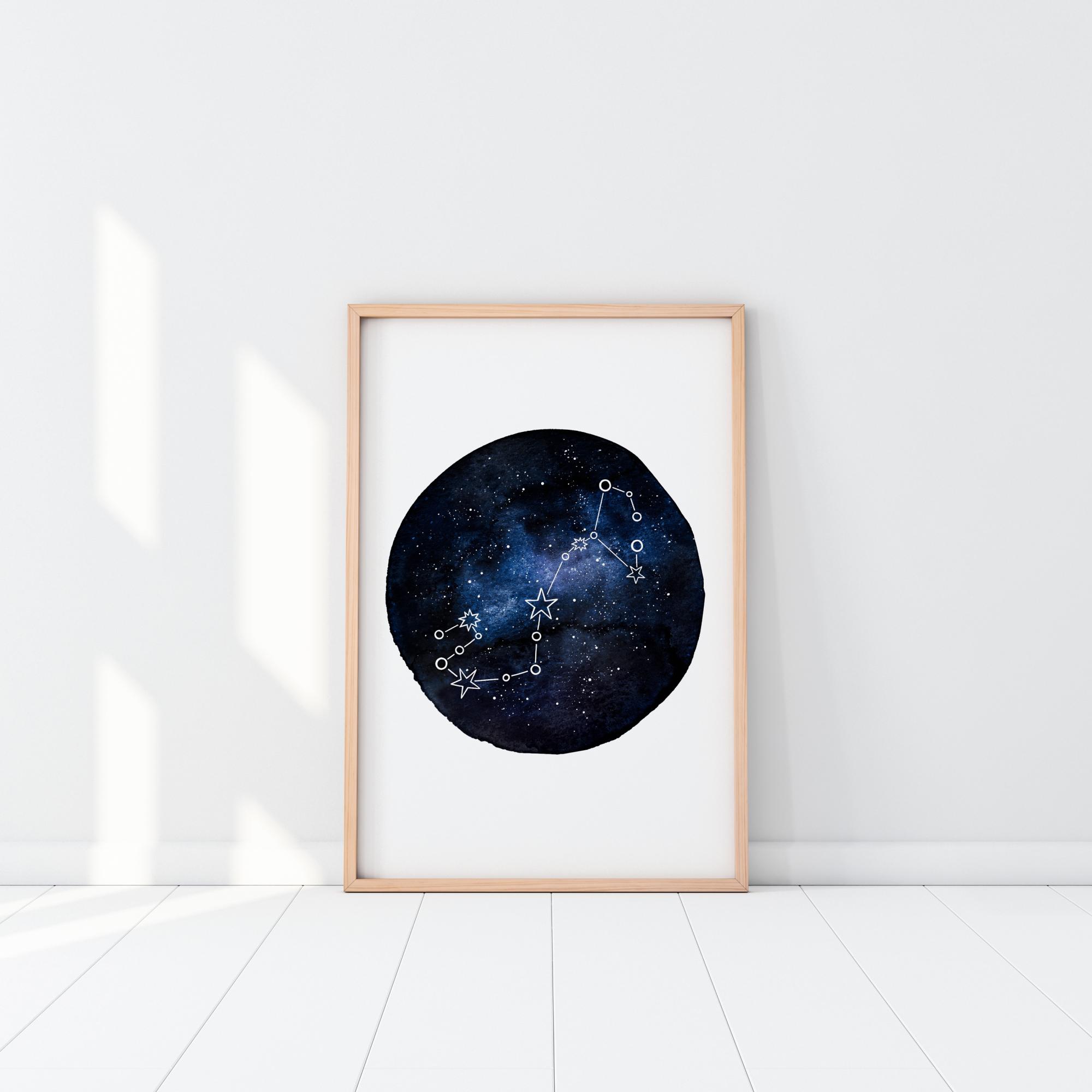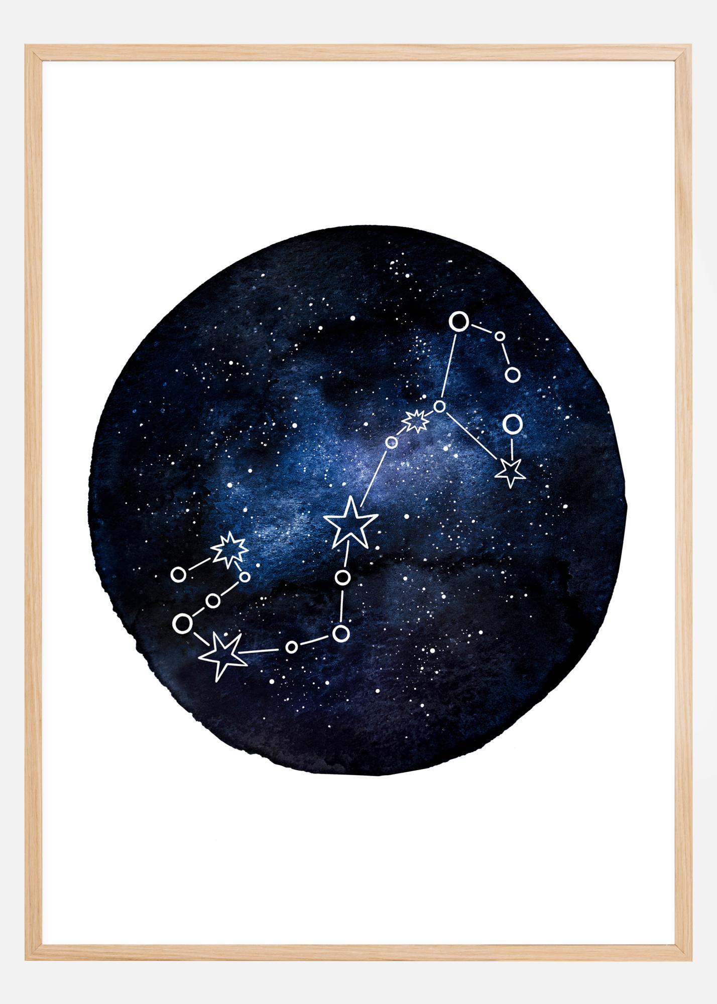 Ein Horoskop-Poster des Sternzeichens Skorpion. Ein großer dunkelblauer Kreis schwebt auf einem weißen Hintergrund. Im Inneren der Kugel befinden sich die Galaxie und Hunderte von verschiedenen Sternen. Oben ist das Sternzeichen Skorpion zu sehen. Eine perfekte Ergänzung, wenn Sie Ihr Sternzeichen zur Schau stellen wollen.