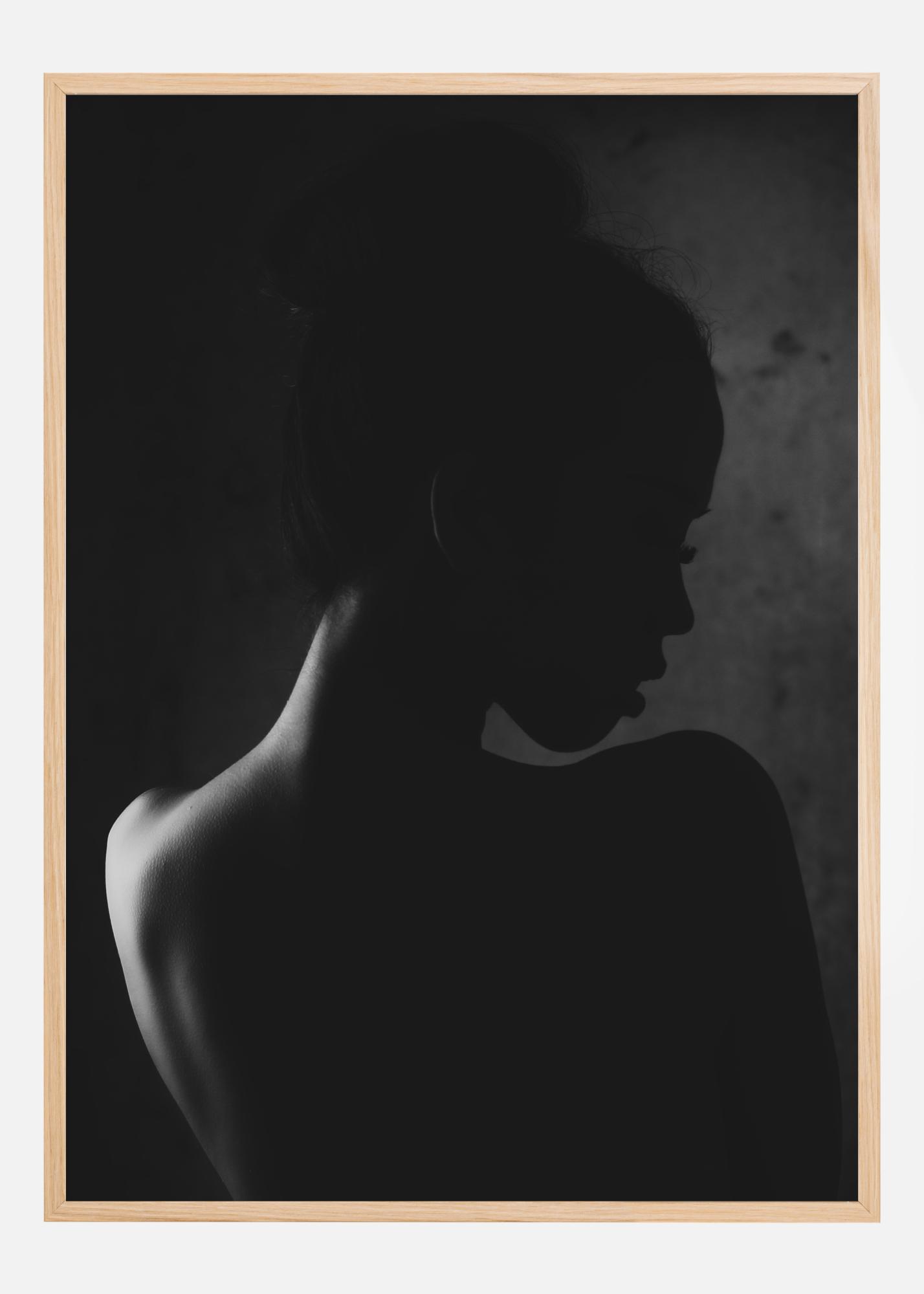 Ein mysteriöses Porträtposter einer jungen Frau, die Ihnen den Rücken zuwendet. Von links beleuchtet, wird ihre Schulter in einem weißen Licht hervorgehoben, der Rest der Frau liegt im Schatten. Mit gespreizten Lippen wendet sie ihren Kopf halb, um Sie in diesem sinnlichen Bild über ihre Schulter zu betrachten.