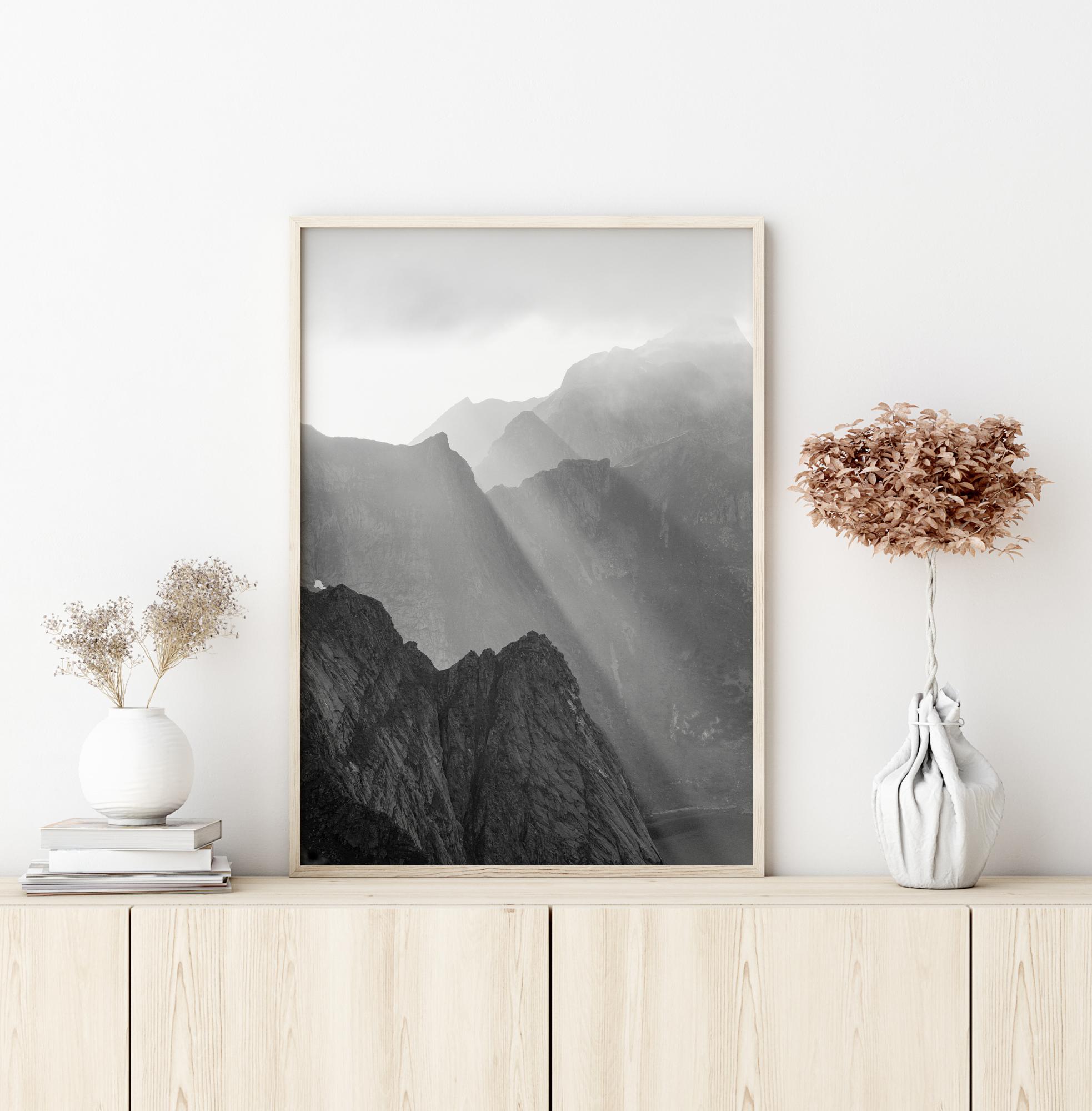 Ein majestätisches Landschaftsposter, bei dem ein starker Sonnenstrahl durch die Berge scheint. Die dunklen, zerklüfteten Formen der Berghänge ragen in den strahlend weißen Himmel, durch den die Sonne scheint. Hängen Sie diese atemberaubende Aufnahme an Ihre Wand und schaffen Sie eine aufregende und zugleich magische Szene.