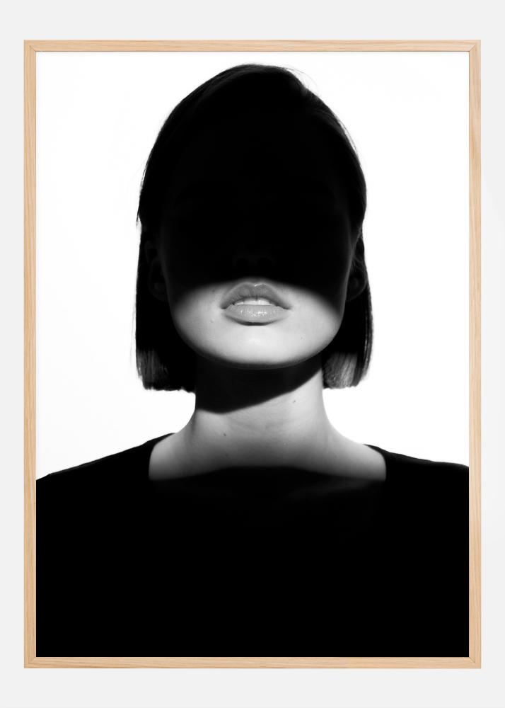 Dieses eindrucksvolle Poster fängt ein kraftvolles Bild einer Frau ein, deren Augen von einem dunklen Schatten verdeckt sind, was einen mysteriösen und nachdenklichen Effekt erzeugt. Der scharfe Kontrast zwischen den weißen Highlights und den tiefen Schwarztönen akzentuiert ihre markanten Lippen und skulpturalen Gesichtszüge. Es ist ein Bild, das auf der Grenze zwischen Sichtbarkeit und Anonymität, Licht und Dunkelheit balanciert und den Betrachter dazu einlädt, nach tieferer Bedeutung zu suchen.