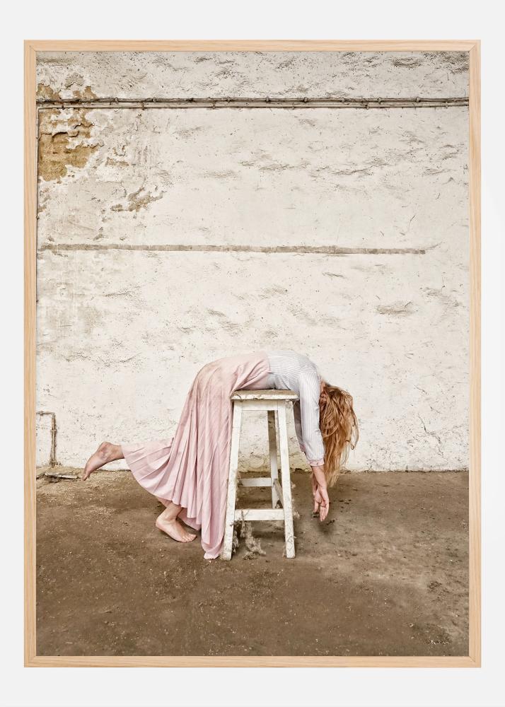 Dieses fesselnde Poster fängt eine ungewöhnliche und emotional aufgeladene Szene ein. Eine Person ist in einer suggestiven Position über einem weißen, abgenutzten Hocker dargestellt, mit nach unten geneigtem Kopf und einem elegant zum kahlen Betonboden ausgestreckten Arm. Die Person trägt einen hellrosa Rock und ein gestreiftes Hemd, die zusammen mit dem rohen Hintergrund einer abgenutzten Wand einen starken visuellen Kontrast bilden. Die blasse rosa Farbe des Rocks und die weichen Weiß- und Blautöne im Hemd harmonieren wunderbar mit den neutralen Nuancen der Wand und dem gealterten Holz des Hockers.