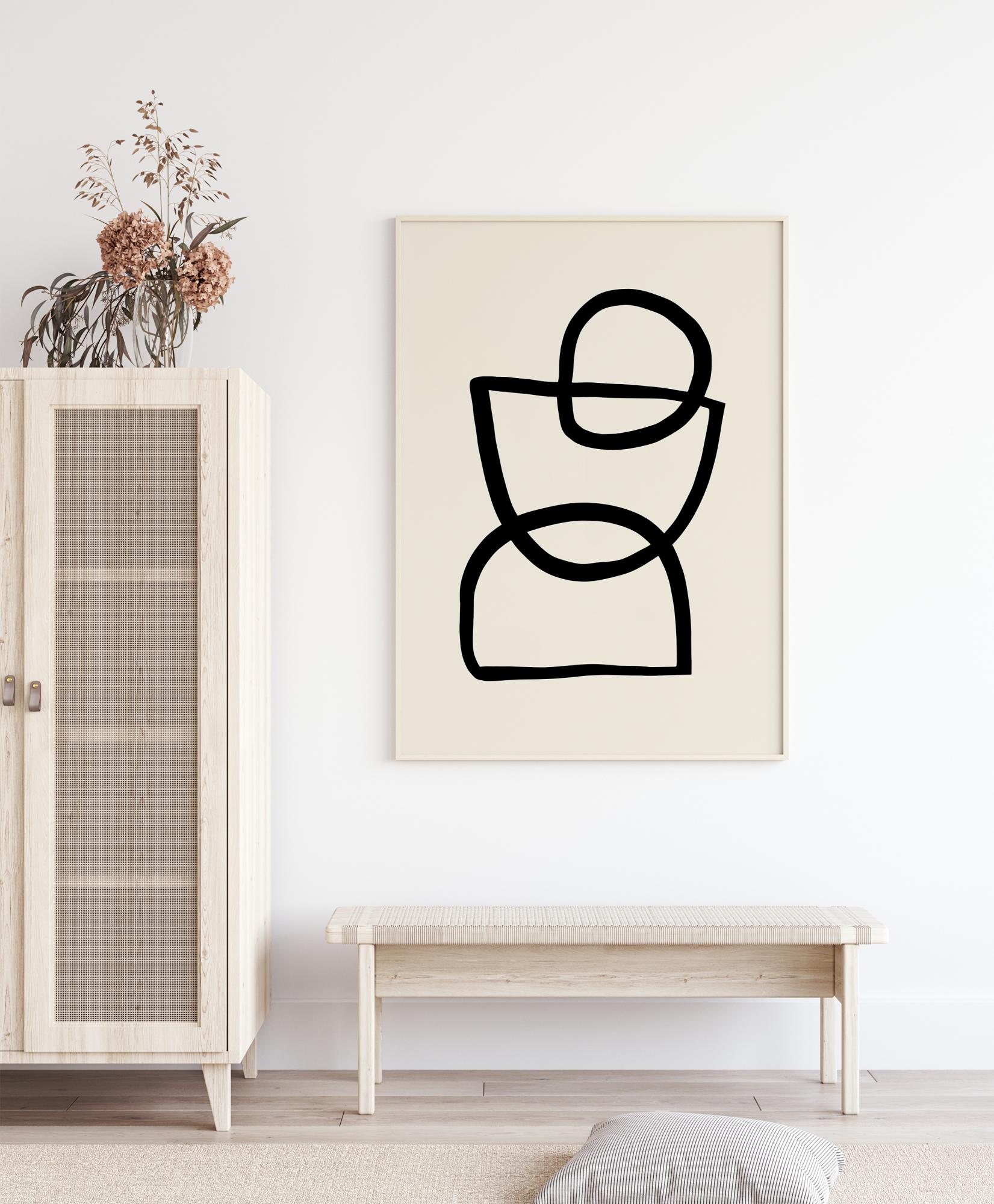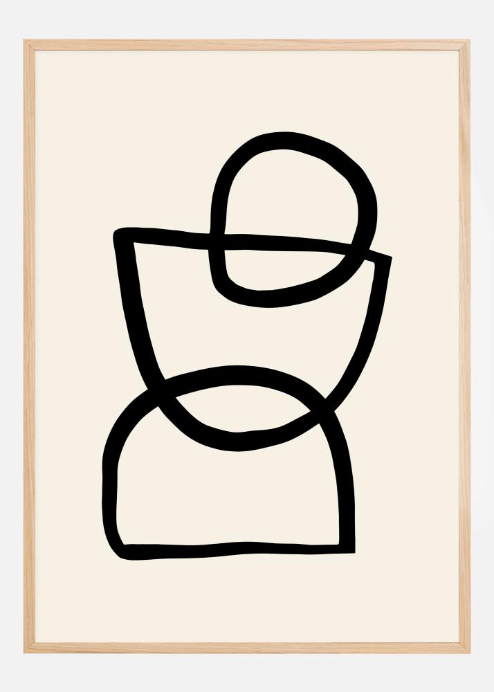 Ein lustiges abstraktes Poster mit drei verschiedenen Formen, die jeweils mit einer fetten schwarzen Linie gezeichnet sind. Es gibt zwei Halbkreise und einen vollständigen Kreis an der Spitze. Diese überschneiden sich und bilden ein abstraktes Muster. Hängen Sie es zu Hause auf und interpretieren Sie das Bild so, wie Sie es möchten. Ist es eine Person, ein Eierbecher, eine Sanduhr? Das bleibt Ihnen überlassen.