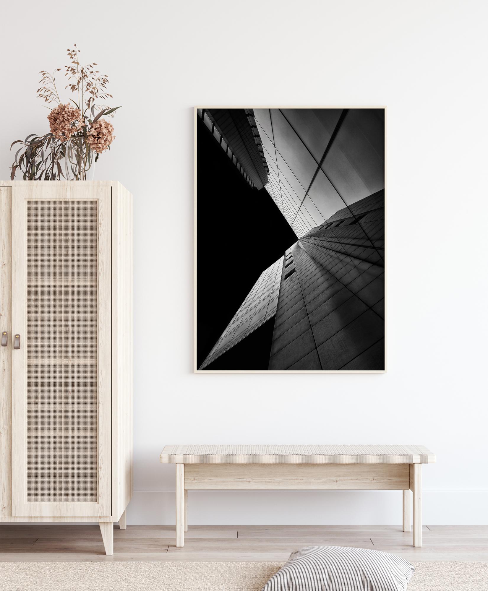 Ein architektonisches Schwarz-Weiß-Poster der Seite eines Gebäudes bei Nacht. Die geometrischen Linien der Fenster führen das Auge in die Mitte des Bildes. Die strahlend weißen Gebäude spiegeln sich im Glas, und der Nachthimmel bildet einen starken Kontrast zur Seite des Gebäudes. Kombinieren Sie es mit einer farbigen Wand, um den Kontrast auf die Spitze zu treiben.