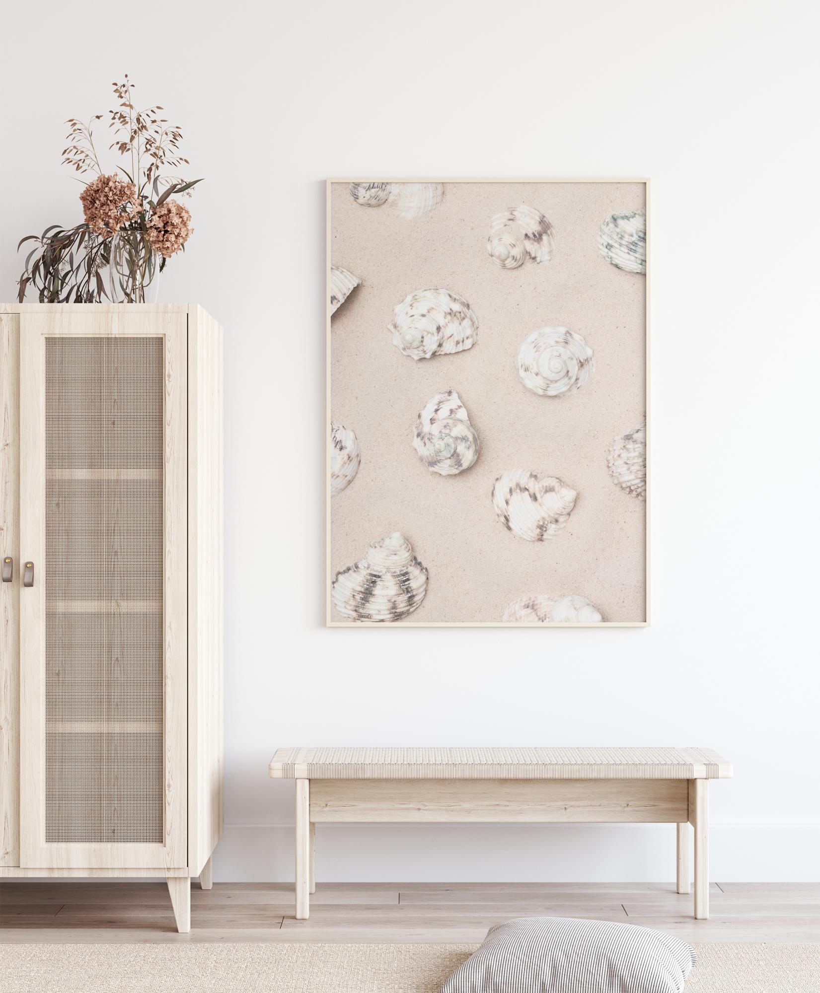 Ein pastellfarbenes Poster mit Muscheln auf einem blassrosa Hintergrund. Zwölf sich kräuselnde Muscheln sitzen in verschiedenen Positionen, die gleichmäßig über das Bild verteilt sind. Jede Muschel ist weiß und braun und ergibt ein sehr weiches Bild, das sich perfekt als zusätzliches Muster an einer schlichten Wand eignet.