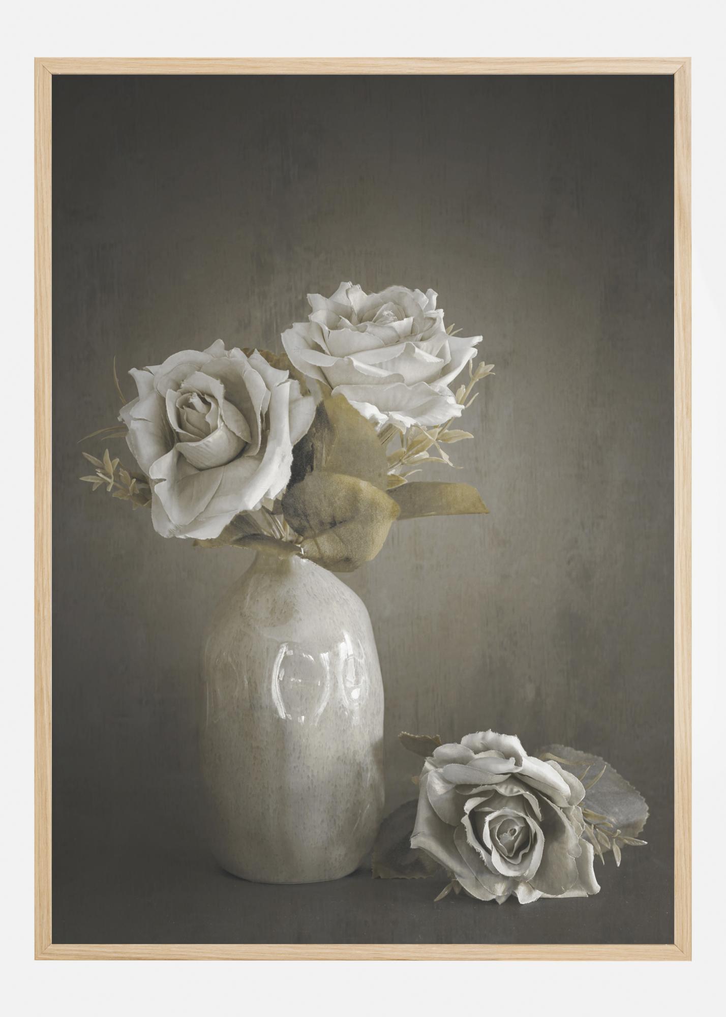 Ein einfaches Poster mit gemalten Rosen in einer Vase. Zwei weiße Rosen stehen in einer weißen Vase, eine dritte Rose ist auf dem Regal daneben platziert. Jede Rose leuchtet mit unsichtbarem Licht vor einem weichen, aber dunkelgrauen Hintergrund, der ein elegantes und doch theatralisches Bild erzeugt.