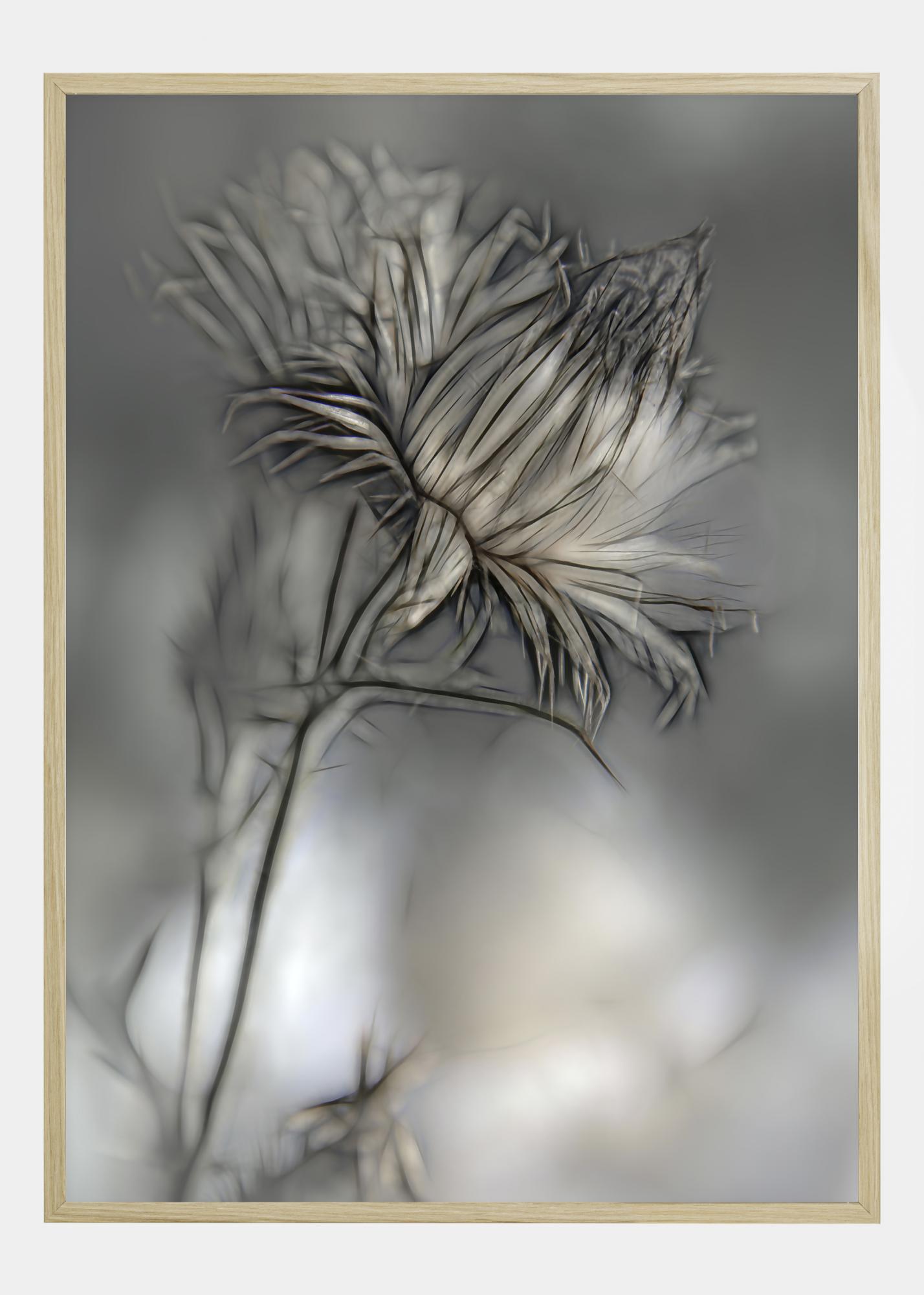 Ein Poster eines Blumenkopfes in Nahaufnahme. Sanfte Blau-, Grau- und Rosatöne füllen dieses Bild, während sich die Blume scharf von dem sanft verschwommenen Hintergrund abhebt. Man kann fast die Hand ausstrecken und die Blume von diesem atemberaubenden, weichen Bild pflücken.