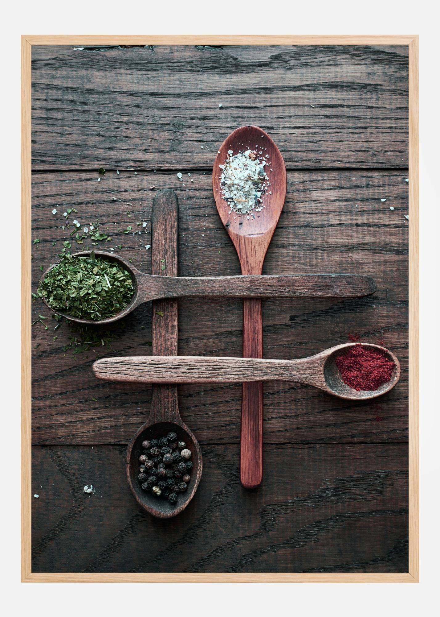 Ein Stillleben-Poster mit vier Holzlöffeln, die jeweils ein anderes Gewürz enthalten. Die vier Löffel überkreuzen sich und bilden ein Gitter auf einem rustikalen Holztisch. Aus jeder Schale quellen Kräuter und Gewürze hervor, die ein lustiges Kochambiente schaffen - perfekt für Ihre Kücheninspiration.