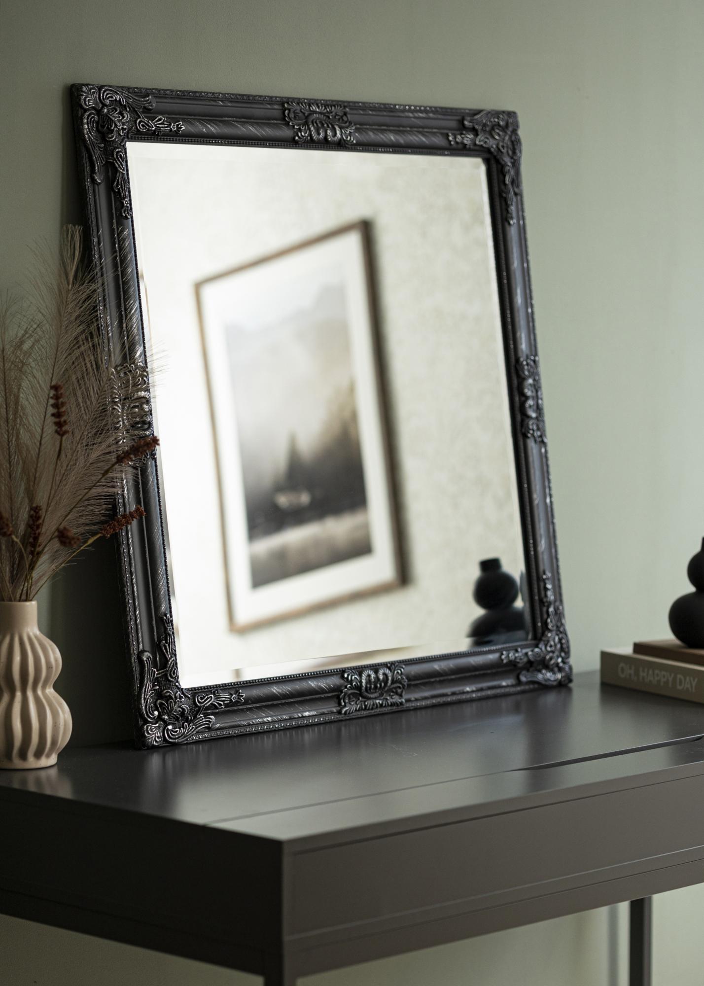 Dieser Spiegel zeichnet sich durch seine quadratische Form aus, die Struktur und Ordnung im Raum schafft, umgeben von einem dunklen, detaillierten Rahmen, der einen ausdrucksstarken und raffinierten Stil verleiht. Der schwarze Rahmen ist mit feinen Details verziert, die an die prunkvolle Ästhetik des Barock erinnern und Ihrem Interieur einen luxuriösen und dramatischen Touch verleihen.