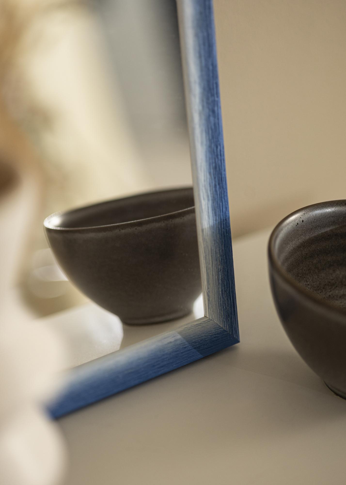 Dieser Spiegel hat eine lebendige Farbskala, die von einem hellen, fast weißen Ton bis zu einem tieferen Blau reicht. Diese Farbvariation verleiht dem Spiegel ein dynamisches Aussehen, das sich je nach Licht im Raum verändern kann. Die Oberfläche hat eine deutliche Holzstruktur mit vertikalen Maserungen, die ein natürliches und taktiles Gefühl bieten. Der Übergang zwischen den verschiedenen Schattierungen ist weich und verleiht dem Rahmen einen handgemalten, einzigartigen Ausdruck.