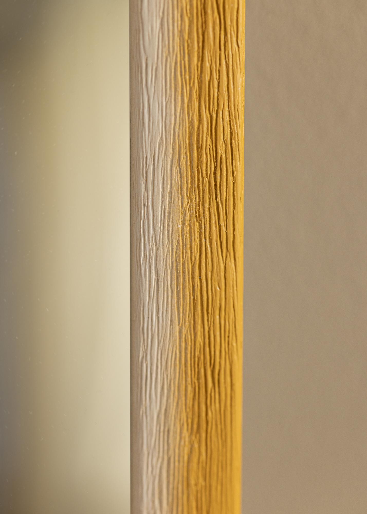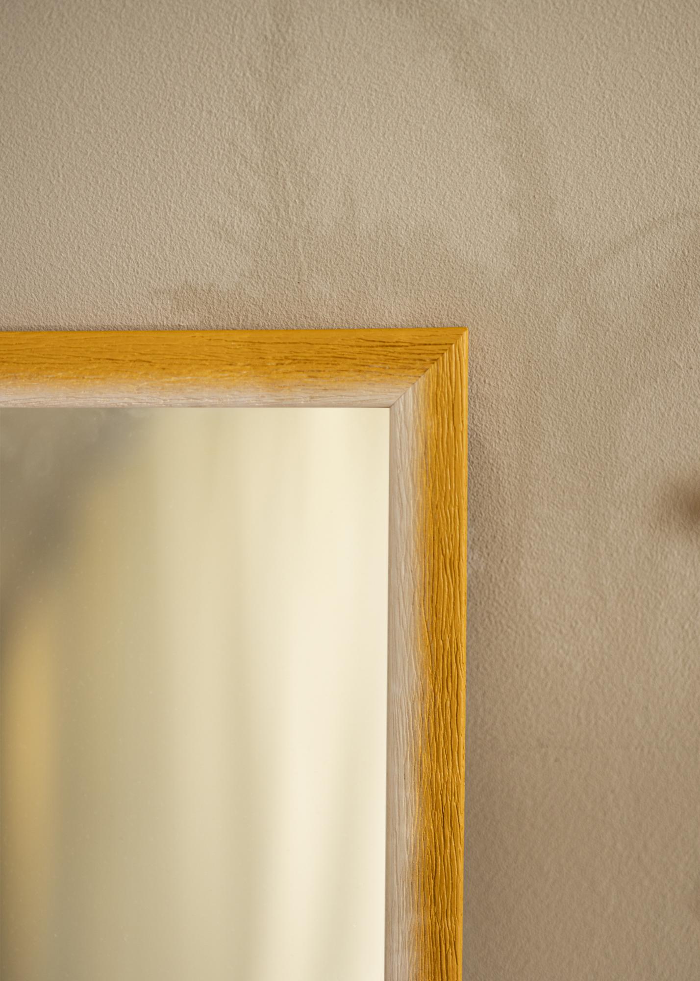 Dieser Spiegel zeichnet sich durch seinen harmonischen Farbverlauf von einem hellen, naturweißen Ton zu einem warmen Ockergelbton aus. Dieser subtile Übergang schafft einen weichen, gemalten Ausdruck, der dem Raum eine lebendige Tiefe verleiht. Die Oberfläche des Rahmens ist mit einer deutlichen Holzstruktur mit tiefen Maserungen geprägt, was ein taktiles und natürliches Gefühl vermittelt. Dies macht den Spiegel nicht nur funktional, sondern auch zu einem dekorativen Detail in Ihrem Zuhause.