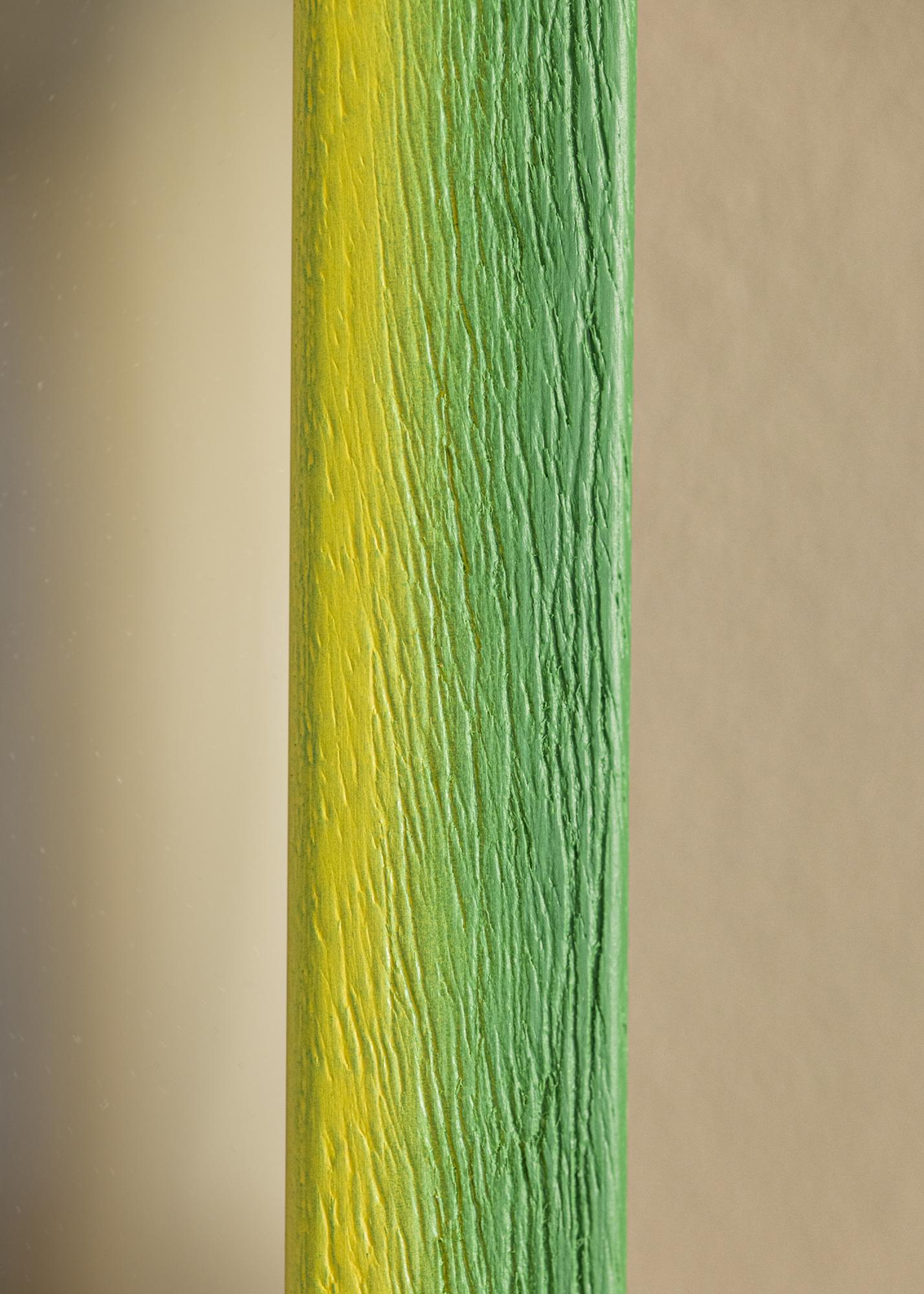Dieser Spiegel zeichnet sich durch seine lebhafte Farbskala aus, bei der ein weicher Übergang von Sonnengelb zu sattem Grün eine harmonische und einladende Atmosphäre schafft. Die Oberfläche ist geprägt von einer markanten Holzstruktur mit tiefen Maserungen, die dem Spiegel ein taktiles Gefühl verleihen, das sowohl modern als auch rustikal ist. Die Farbtöne verschmelzen natürlich und erzeugen einen handgemalten Effekt mit einem organischen Ausdruck, was jeden Spiegel einzigartig macht.