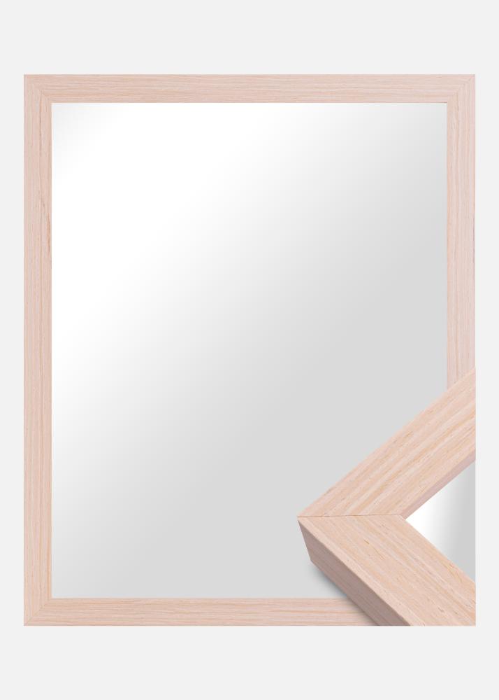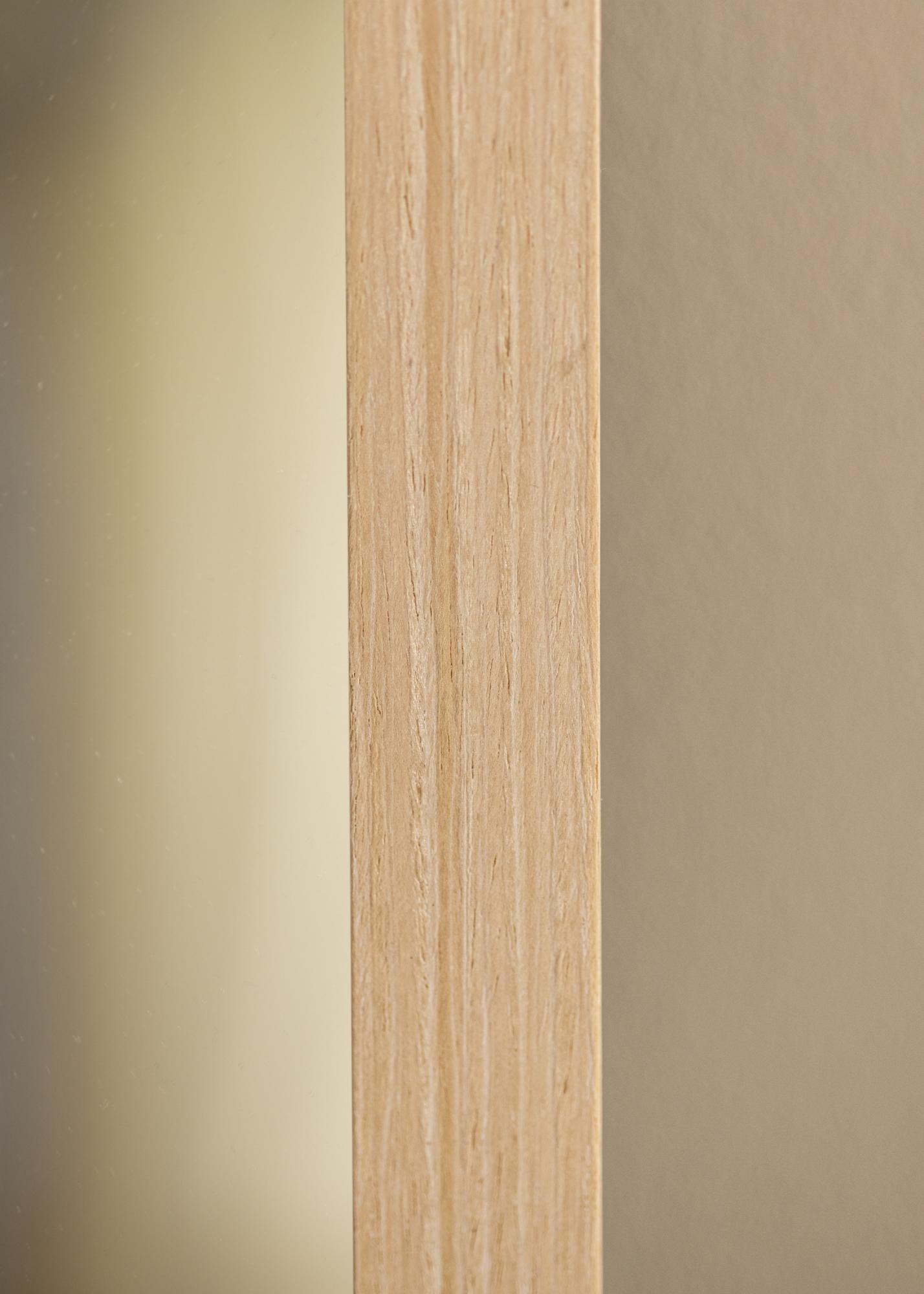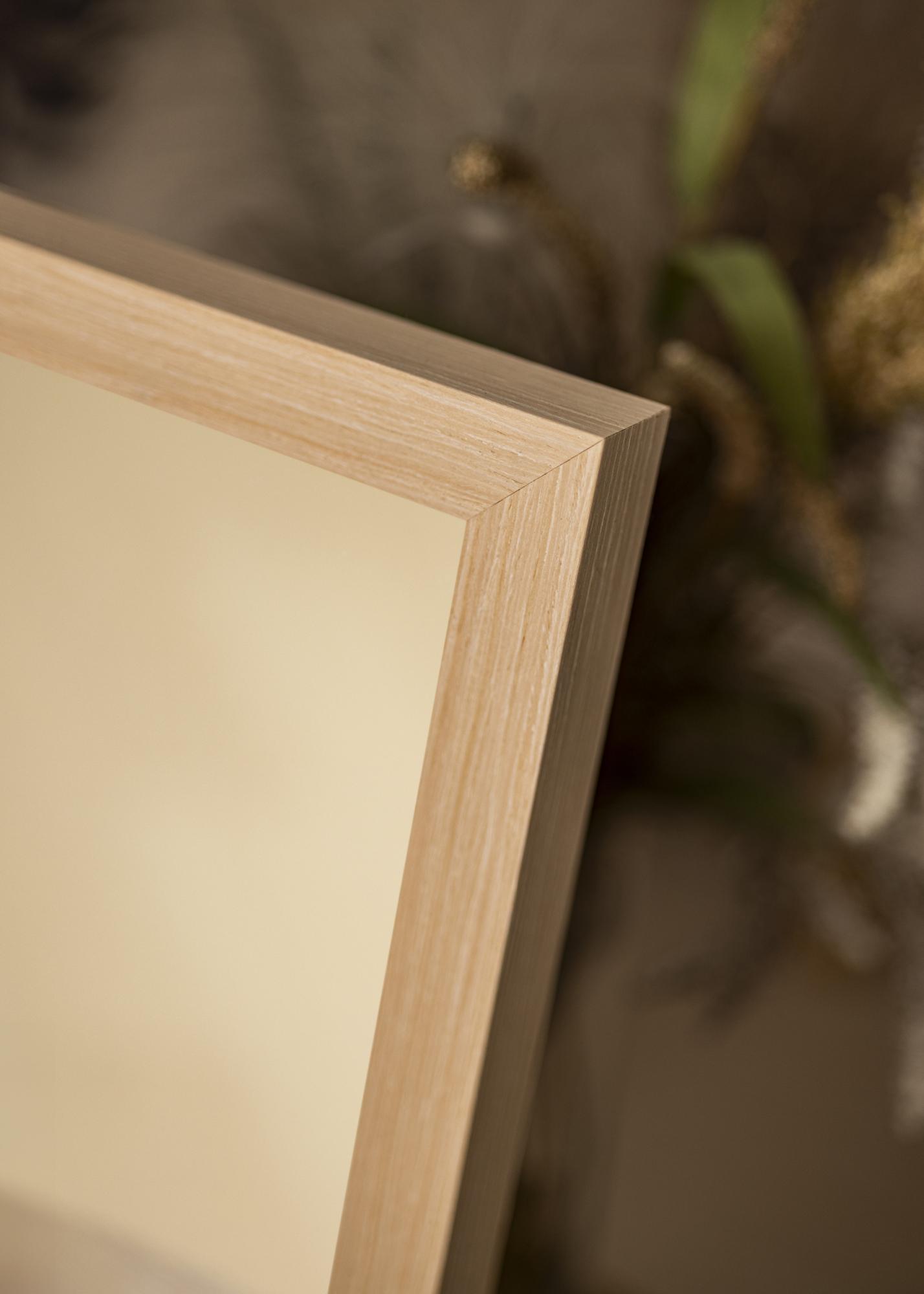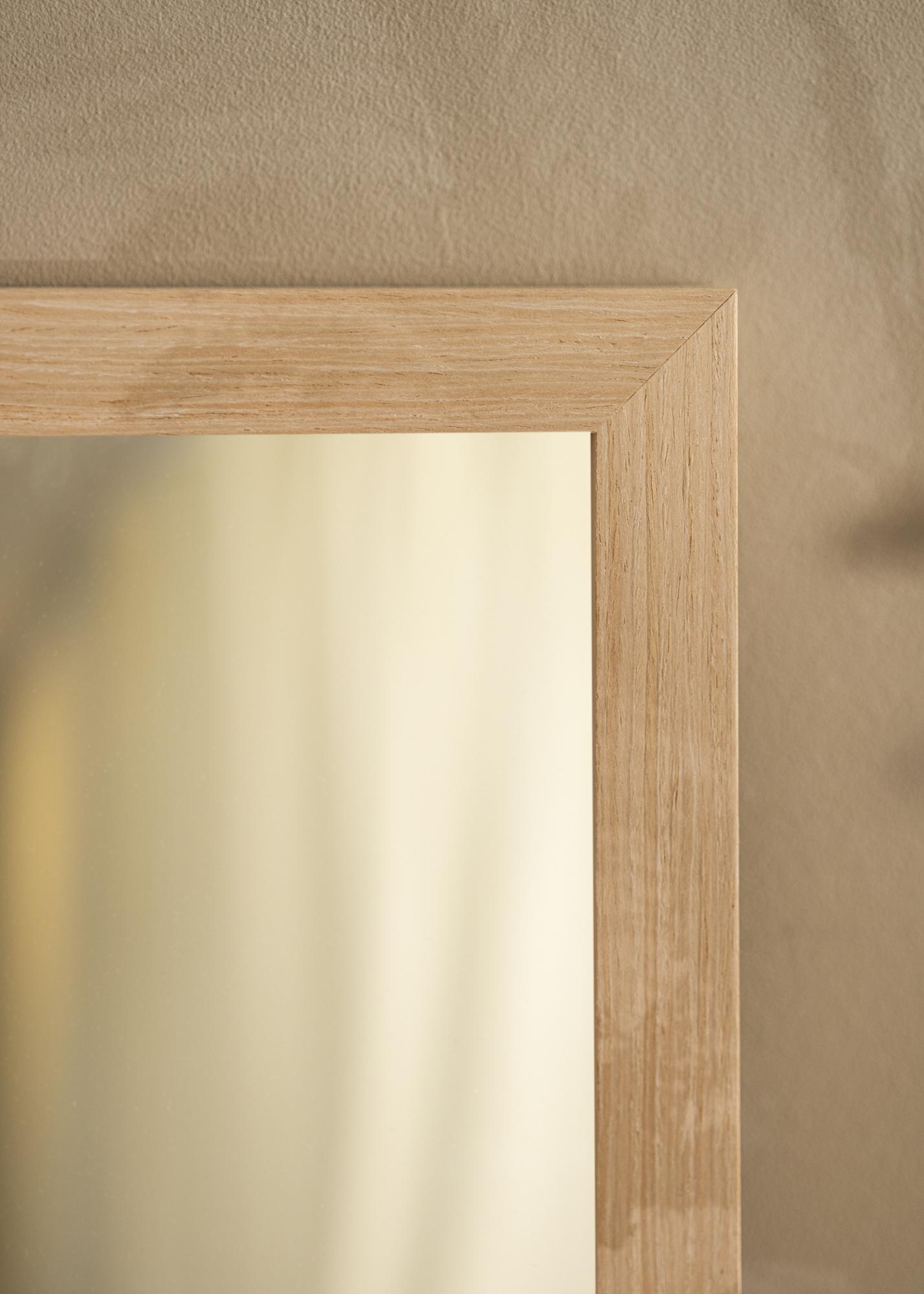 Der Rahmen des Spiegels ist 28 mm breit und hat eine Tiefe von 33 mm, was ein stabiles und robustes Gefühl vermittelt, ohne den Raum zu dominieren. Hergestellt aus Kiefernholz, kombiniert er Haltbarkeit mit einer Leichtigkeit, die eine einfache Handhabung und Montage ermöglicht. Das seidenmatte Finish hebt die natürliche Struktur des Holzes hervor, ohne Licht zu reflektieren, und schafft eine angenehme Atmosphäre im Raum.