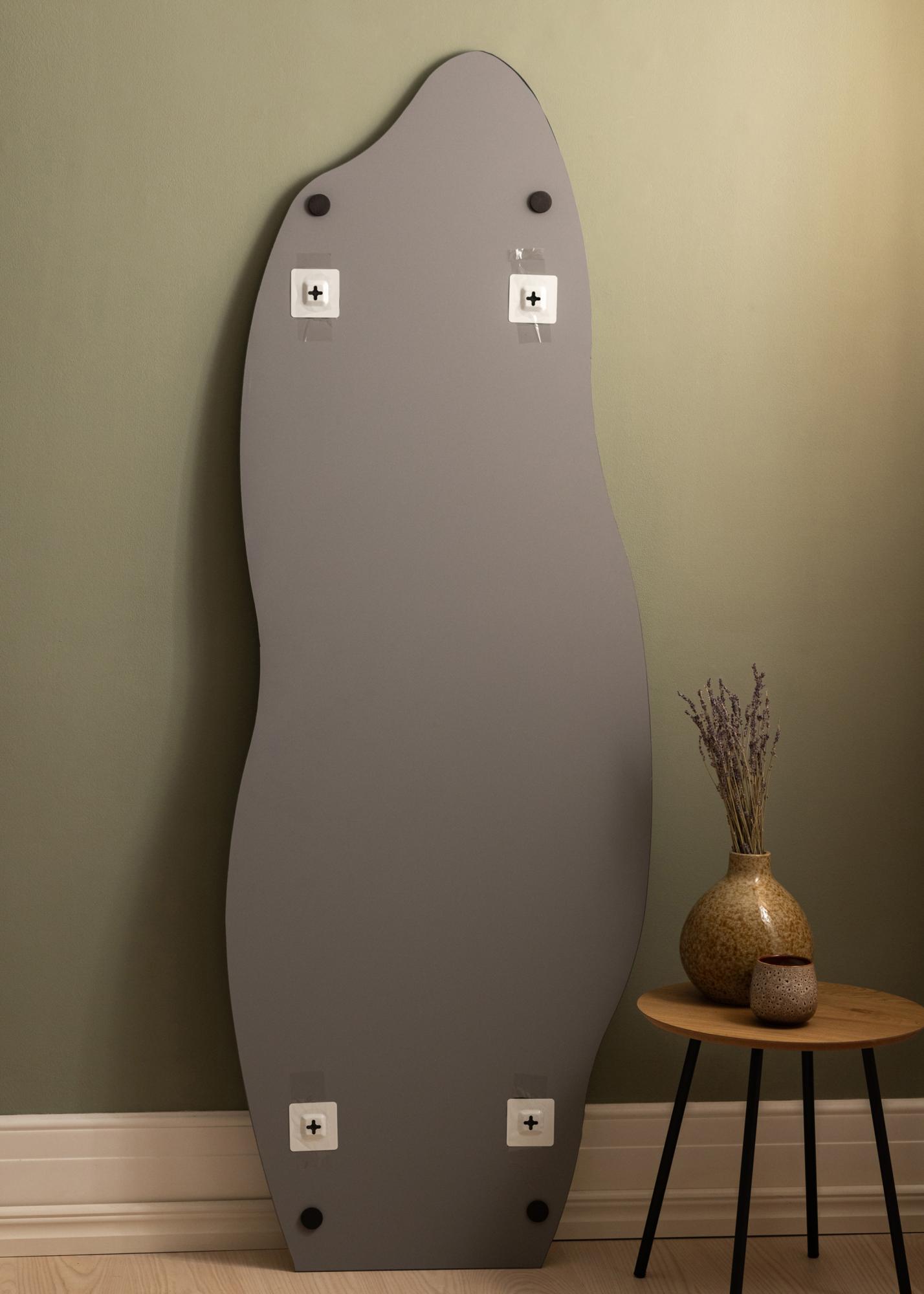Der Spiegel hat eine einzigartige, wellenähnliche Form, die an der Basis breit ist und elegant nach oben schwingt. Diese ungewöhnliche Form macht ihn zu einem Kunstwerk für sich und verleiht Ihrer Wand eine dynamische Note. Er ist dafür gestaltet, ein zentraler Punkt in Ihrem Zuhause zu sein, egal, ob er im Flur, Schlafzimmer oder Wohnzimmer platziert wird.