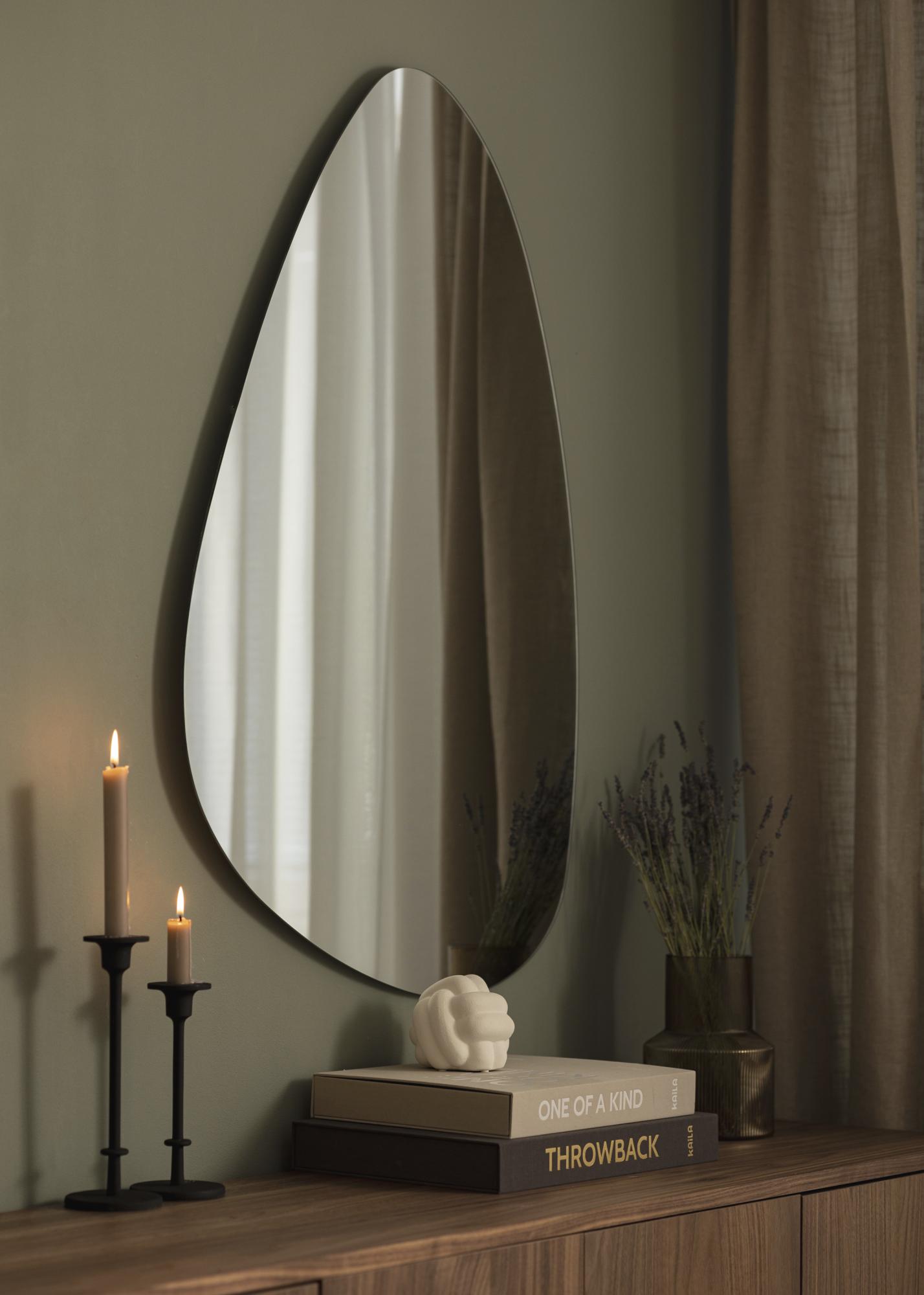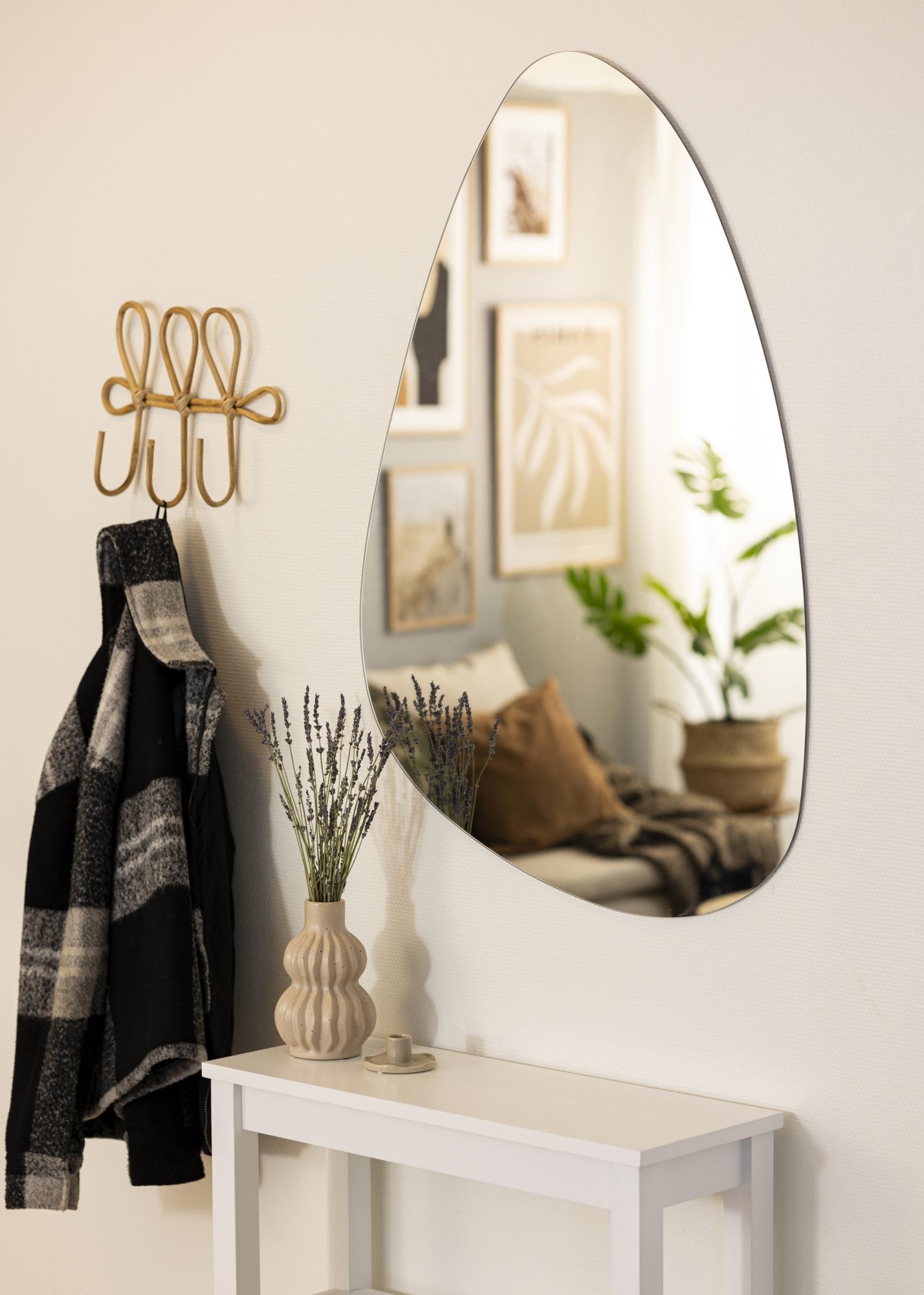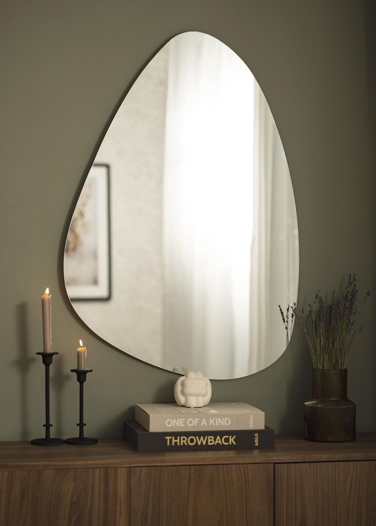 Dieser Wandspiegel ist optimal für alle, die einen eleganten Wohnspiegel in etwas ausgefallenerem Design und minimalistischem Stil suchen. Die asymmetrische, flache Spiegelform ohne Rahmen wirkt sehr stilsicher und elegant. Auf der Rückseite des Wandspiegels befinden sich Halterungen für die Aufhängung an der Wand.