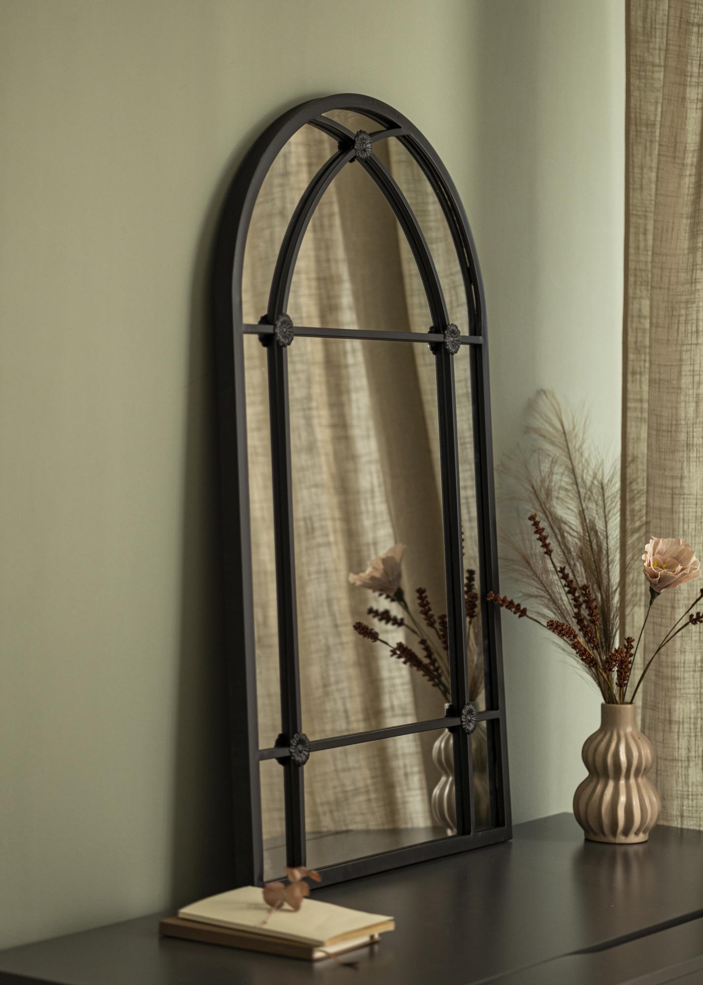 Mit seiner bogigen Silhouette und dem detailreichen Eisenarbeiten erinnert der Spiegel an klassische Fenster, die dem Raum Tiefe und Weite verleihen. Er ist nicht nur ein praktischer Gegenstand für den täglichen Gebrauch, sondern auch eine künstlerische Einrichtungsdetail, das den Blick einfängt und zur Atmosphäre des Raumes beiträgt.