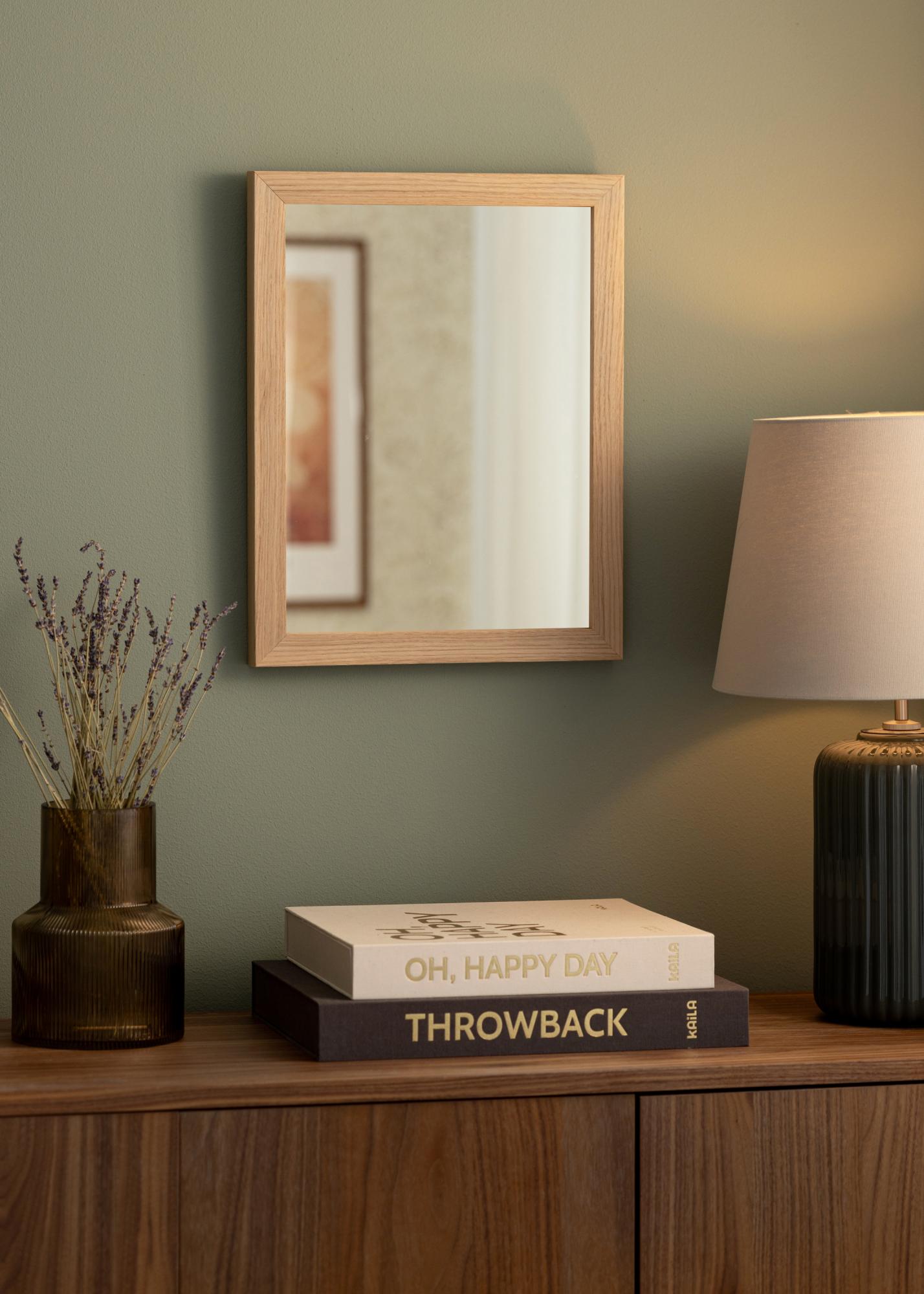Der Rahmen ist aus Kiefer gefertigt, was ihn sowohl langlebig als auch leicht macht. Die Tiefe von 32 mm verleiht dem Spiegel eine stabile Konstruktion und sorgt dafür, dass er sicher an der Wand sitzt. Der warme Ton des Eichenmusters hebt das zeitlose Design des Spiegels hervor und macht ihn leicht mit verschiedenen Einrichtungsstilen kombinierbar.
