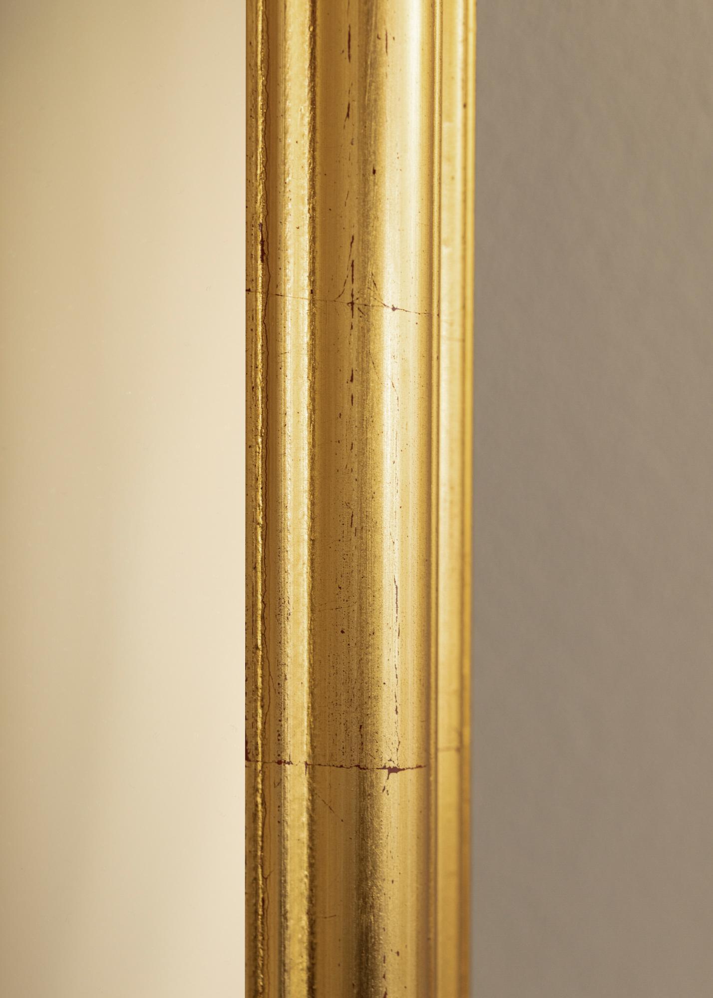 Der Rahmen ist aus Ayous-Holz gefertigt und hat ein sanft gewölbtes Profil, das zum anspruchsvollen Aussehen des Spiegels beiträgt. Die Oberfläche ist antik patiniert mit subtilen Rissen und kleinen dunklen Einsprengseln, was dem Spiegel ein authentisches Vintage-Gefühl verleiht. Die goldene Oberfläche schafft eine warme und klassische Atmosphäre, perfekt, um Ihrem Zuhause einen Hauch von zeitloser Eleganz zu verleihen.