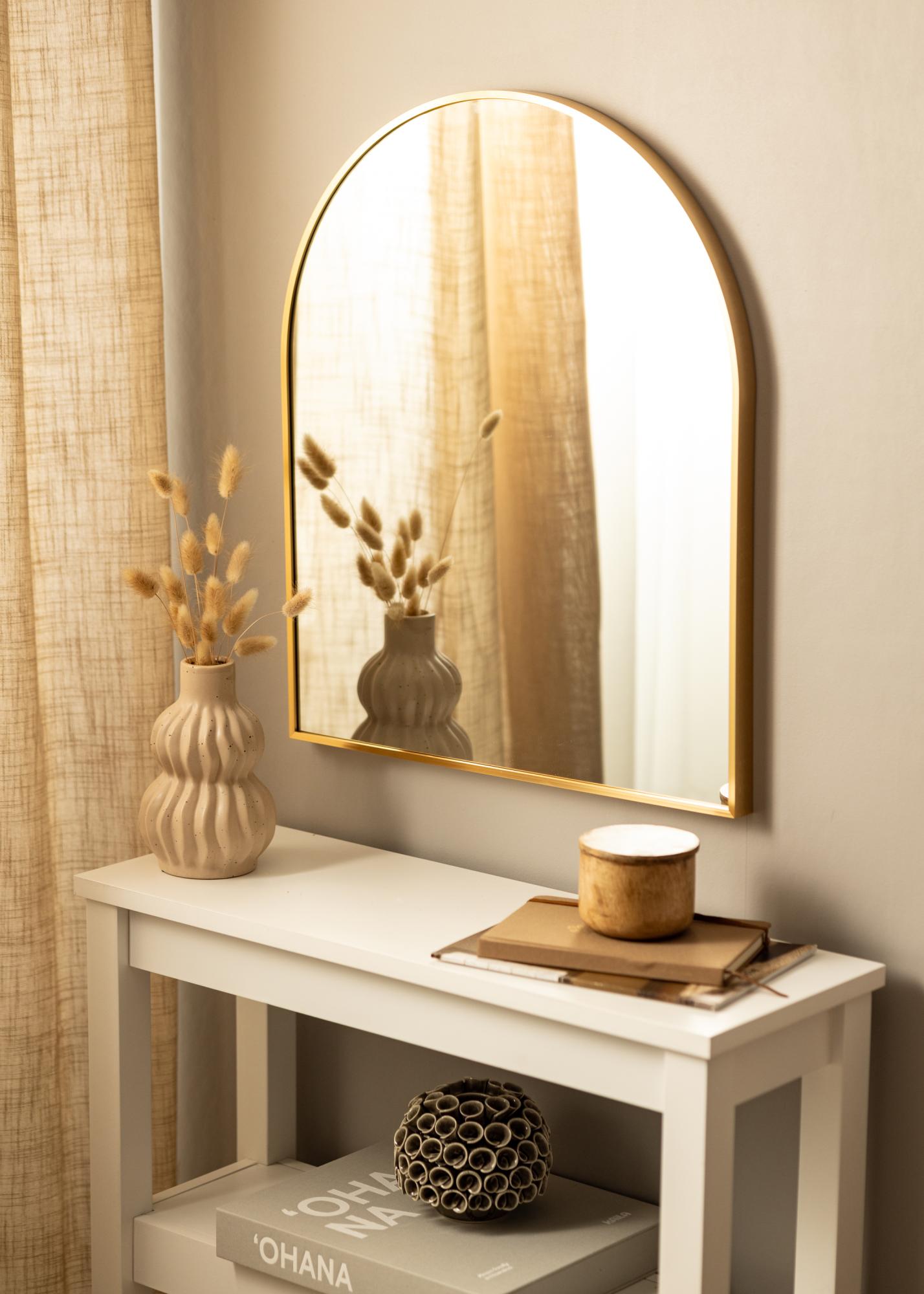 Ein moderner Wandspiegel, der in jedem Zimmer verwendet werden kann und einen echten Blickfang ausmacht. Als trendiges Einrichtungsaccessoire im Schlafzimmer oder als stilsicherer Wohnzimmerspiegel, als dekorativer Badezimmerspiegel oder Flurspiegel im Eingangsbereich, wo man gerne nochmal einen Blick hineinwirft, bevor man das Haus verlässt. Dieser schöne Spiegel ist mit einem 28 mm tiefen Rahmen aus Metall ausgestattet, der durch seinen eleganten, goldenen Farbton seinen ansprechenden, edlen Charakter erhält. Das stilvolle, bogenförmige Design verstärkt den erlesenen, schicken Ausdruck dieses hübschen Wandspiegels einmal mehr.