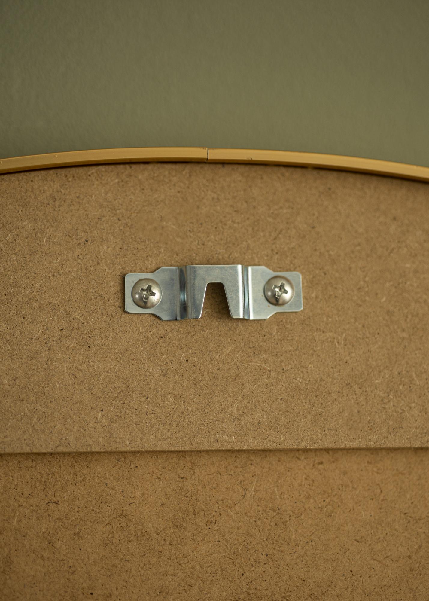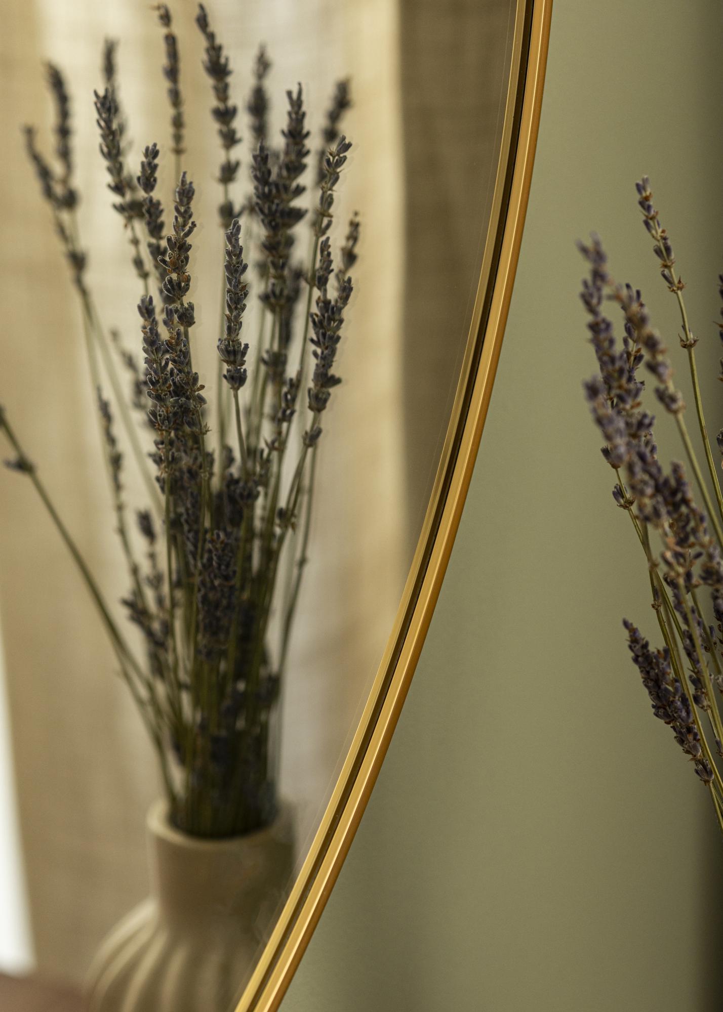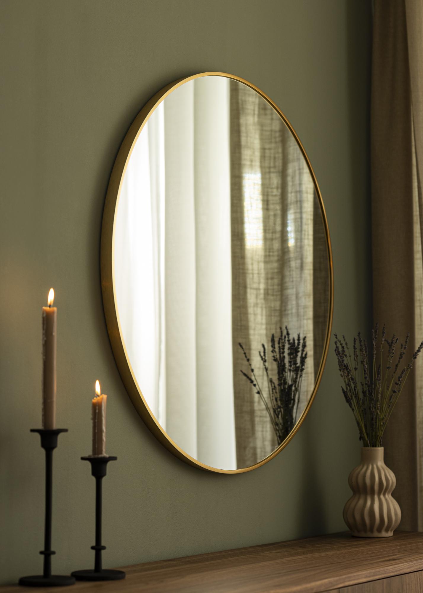 Dieser wandmontierte Spiegel hat eine klassische runde Form, die von einem eleganten goldfarbenen Aluminiumrahmen umgeben ist. Die Farbe und der Glanz des Rahmens schaffen eine luxuriöse Atmosphäre und werden zu einem Blickfang an jeder Wand. Die runde Form trägt zu einem weichen und harmonischen Gefühl im Raum bei.