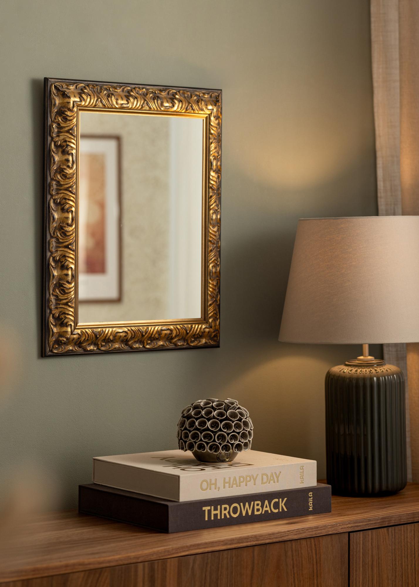 Spiegel Odin Gold/Schwarz ist ein maßgefertigter Spiegel, der von uns hergestellt wird, um genau Ihren Bedürfnissen zu entsprechen. Mit seiner eleganten Goldoberfläche und schwarzen Akzenten bietet dieser Spiegel ein anspruchsvolles und antikes Gefühl, das jeden Raum aufwertet. Das klassische, verzierte Design kombiniert das warme Gold mit tiefen schwarzen Tönen, was einen auffälligen Kontrast und einen zeitlosen Ausdruck schafft.