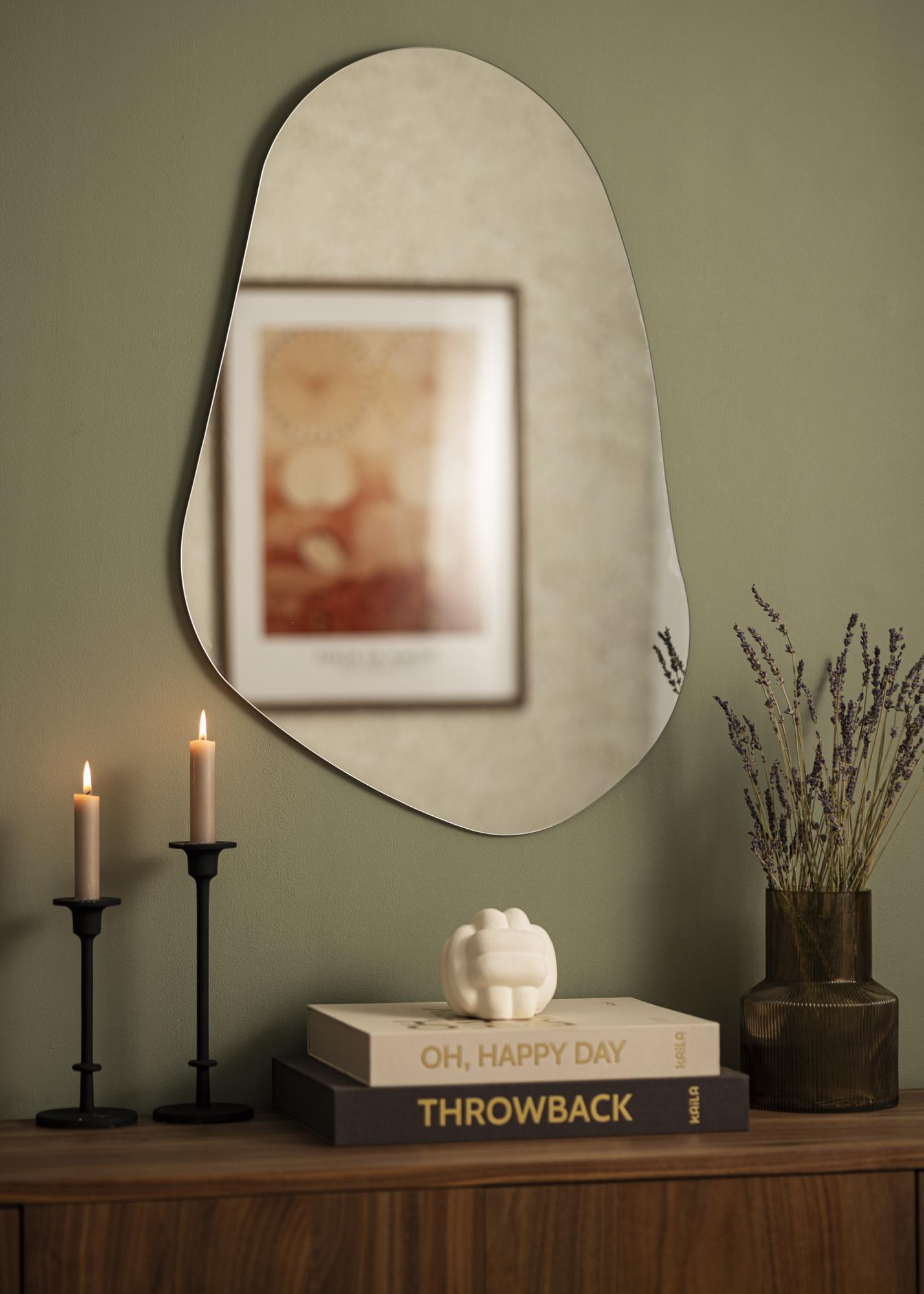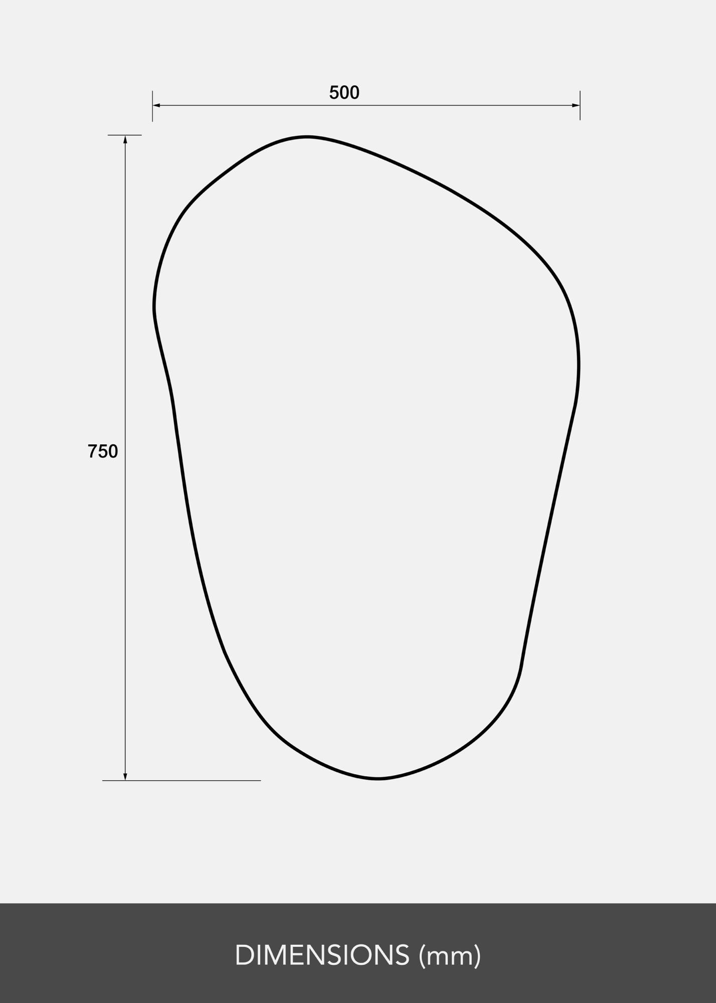 Dieser Spiegel hat eine organische, asymmetrische und sanft geschwungene Form, die einen modernen und künstlerischen Eindruck vermittelt. Mit seinen abgerundeten Kurven und dem Verzicht auf gerade Kanten erinnert er an eine freihändig gezeichnete Silhouette – wie ein natürlich geformter Stein oder eine langgezogene Tropfenform.