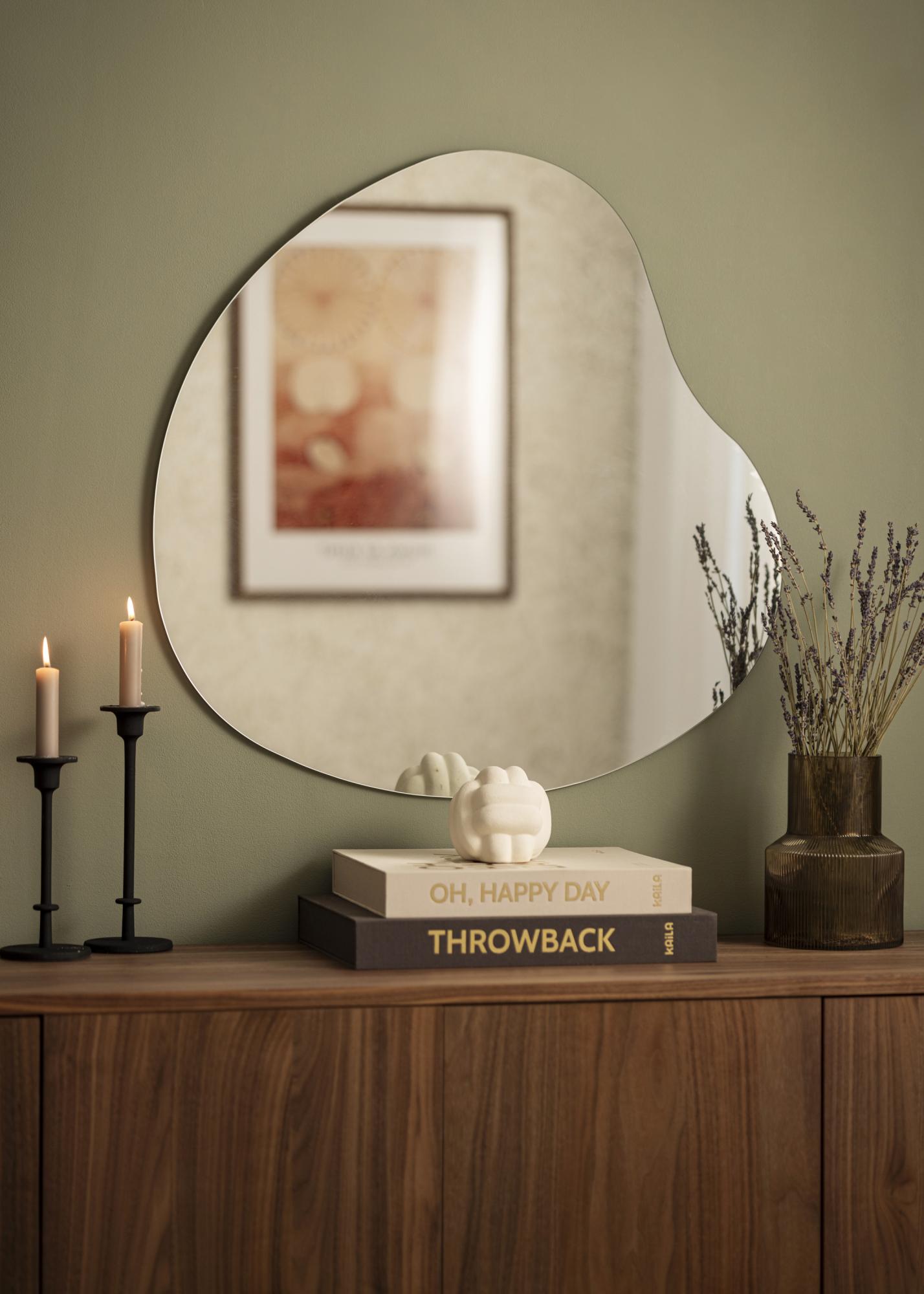 Der Spiegel hat eine weich konturierte, asymmetrische Form, die anmutig schwingt und einen Eindruck von Bewegung und Sanftheit vermittelt. Dieses Design macht den Spiegel zu einem künstlerischen Detail an der Wand, während er seine praktische Funktion behält.