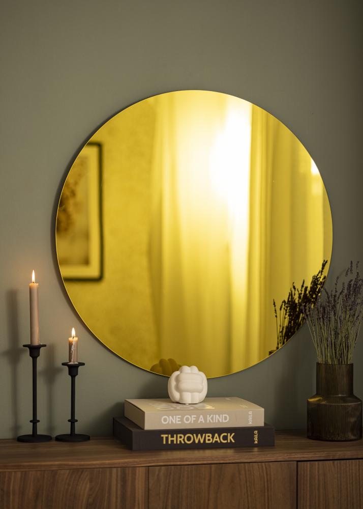 Dieser trendige Wandspiegel macht einen echten Blickfang aus. Ob in Schlafzimmer, Flur oder Wohnzimmer, dieser schöne Wohnspiegel mit gelb getöntem Spiegelglas wirkt als belebender Farbtupfer erfrischend und fröhlich, ohne dabei seinen eleganten, stilvollen Charakter zu verlieren. Durch die flache Ausführung mit dünnem Spiegelglas und dem rahmenlosen Design erhält der Spiegel einen minimalistischen Touch, der ihm ausgesprochen gut steht. Auf der Rückseite des runden Spiegels befinden sich Halterungen für die Aufhängung an der Wand.