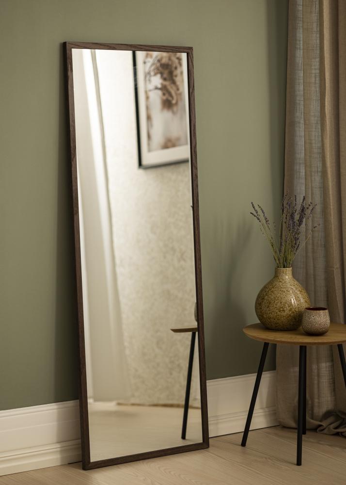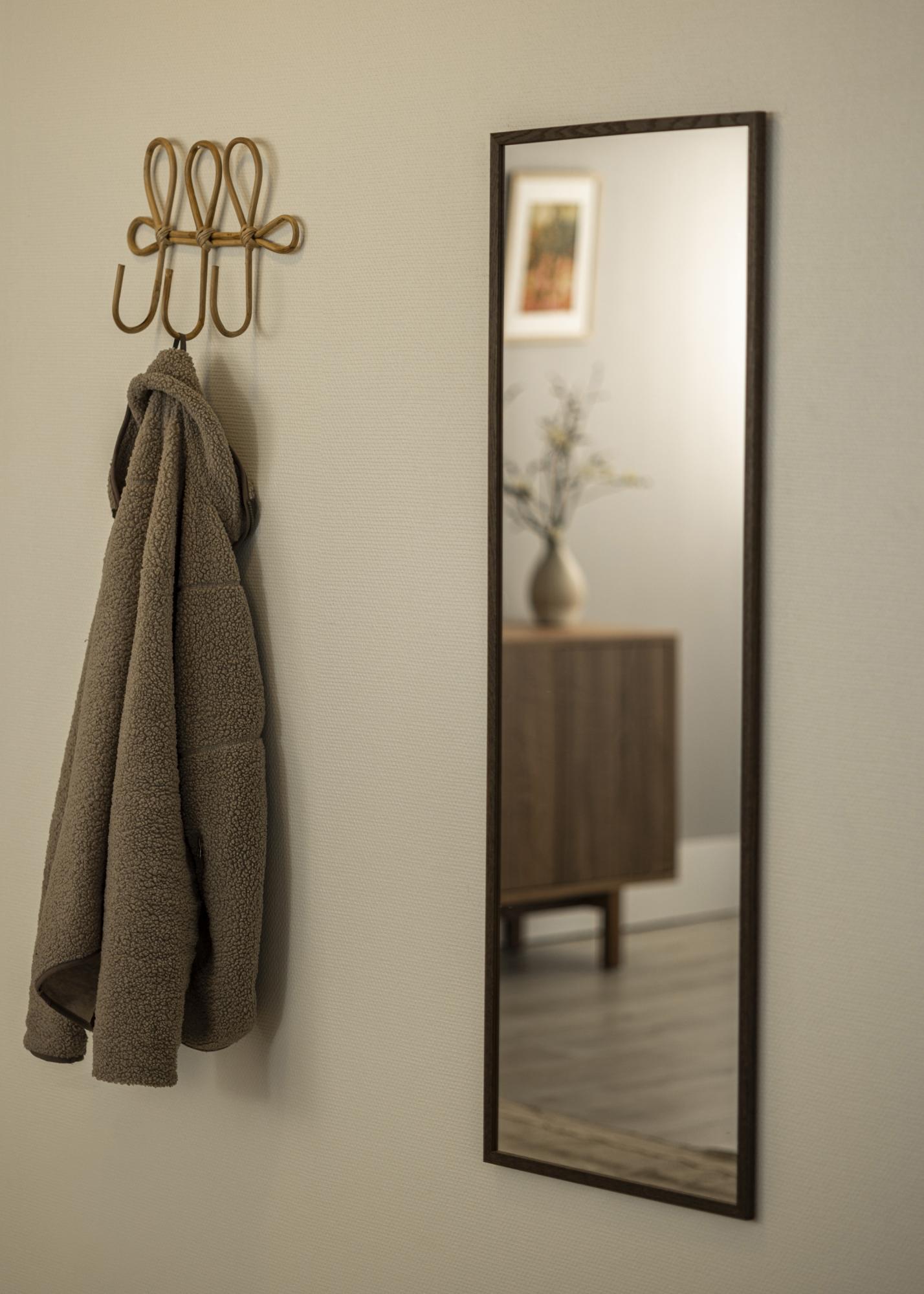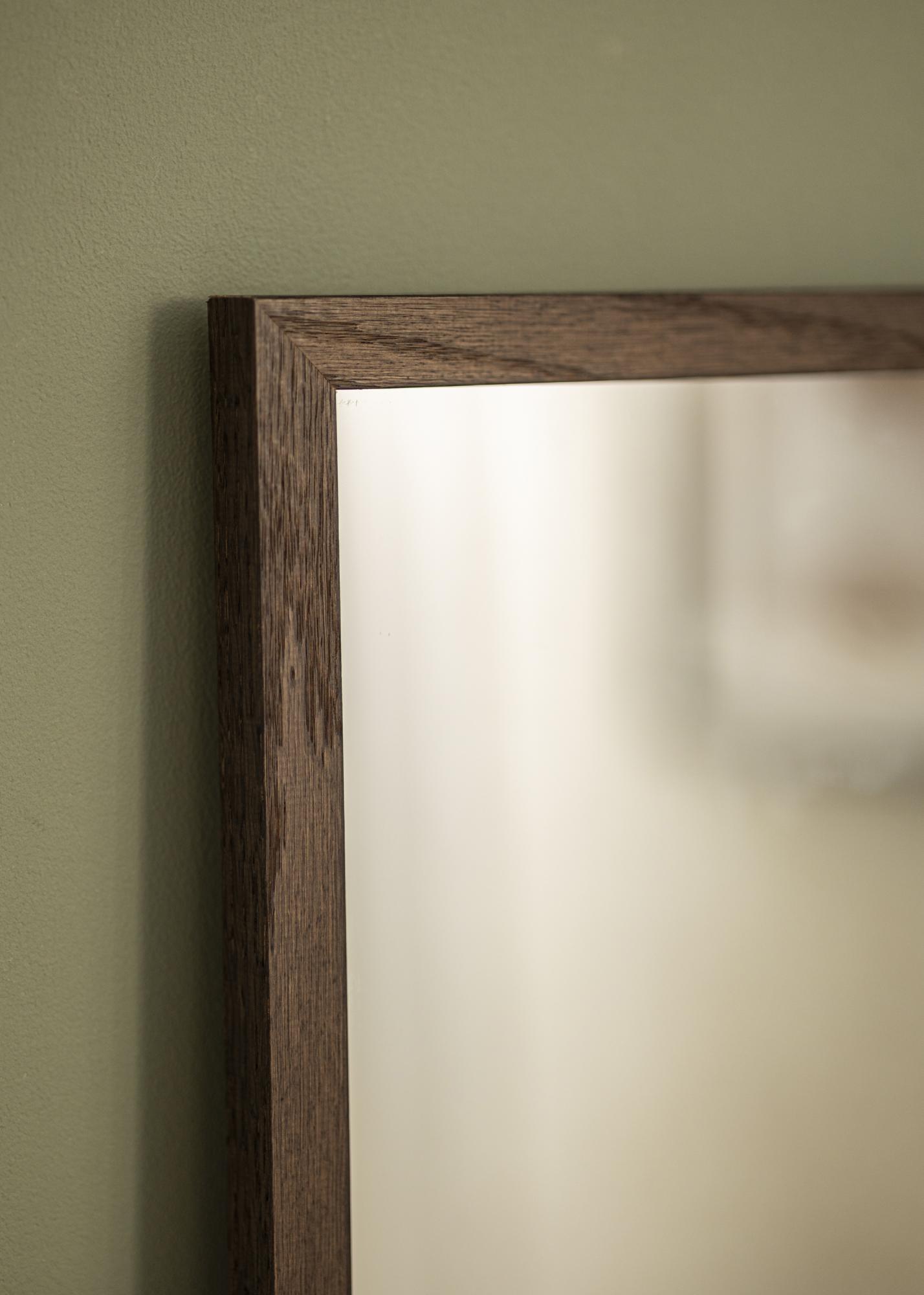 Der Rahmen des Spiegels besteht aus echtem Eichenholz und hat einen tiefen dunklen Eichenton, der sofort die Aufmerksamkeit auf sich zieht. Die Dicke des Rahmens trägt zu einem Gefühl der Robustheit bei und verleiht dem Spiegel eine markante Präsenz an der Wand. Dieser Spiegel ist nicht nur ein praktisches Accessoire, sondern auch ein Kunstwerk, das Ihre Einrichtung ergänzt und aufwertet.