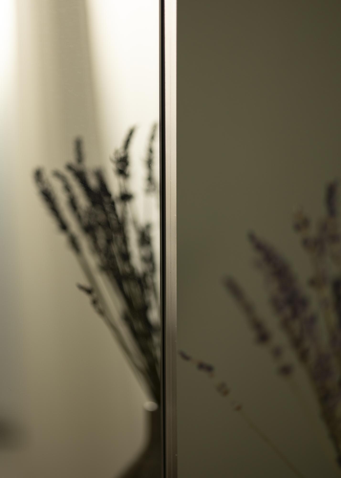 Dieser Spiegel ist mit einem schlanken, silberfarbenen Aluminiumrahmen verziert, der Ihrer Einrichtung einen Hauch von Raffinesse verleiht. Die rechteckige Form ist zeitlos und modern und passt in eine Vielzahl von Einrichtungsstilen. Das minimalistische Design des Spiegels lässt ihn nahtlos in den Raum integrieren und gleichzeitig als elegante Details hervorstechen.