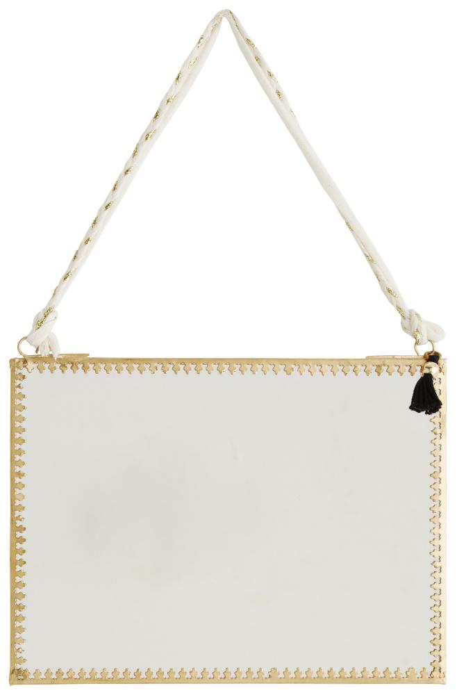 Wunderschöner Spiegel von Madam Stoltz, der in allen Räumen deines Zuhauses zu einem attraktiven Detail wird. Der Spiegel hat einen elegant geformten Goldrahmen und eine dekorative Quaste an einer Ecke. Die Aufhängung ist aus Baumwolle, was dem Spiegel einen Bohemian-Style-Look verleiht. Der Wandspiegel hat die Maße 20×15 cm und durch seine zierliche Größe lässt er sich hervorragend mit anderen Spiegelmodellen kombinieren. Der Spiegel ist handgefertigt, was bedeutet, dass jeder einzelne Artikel im Aussehen leicht variieren kann.