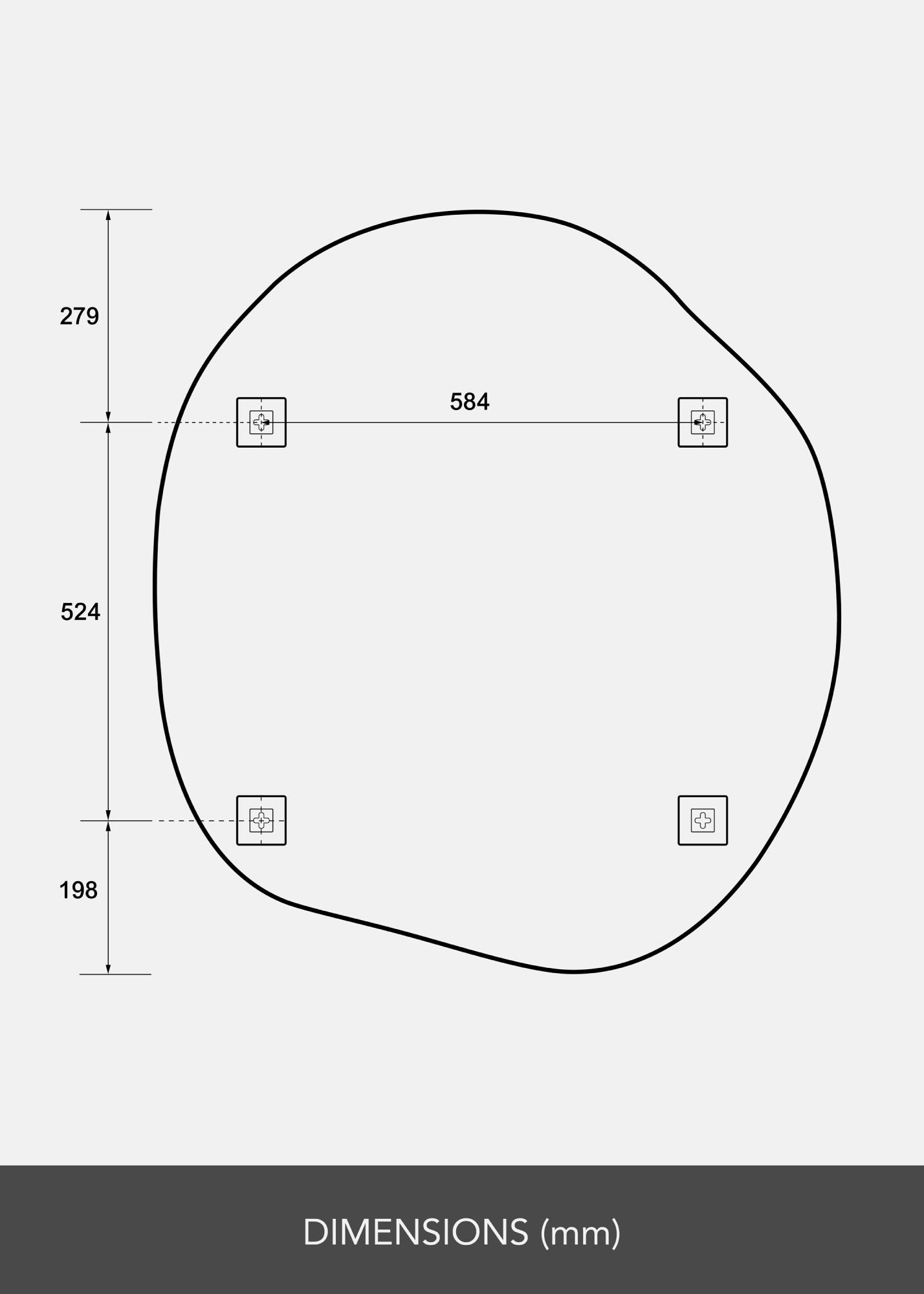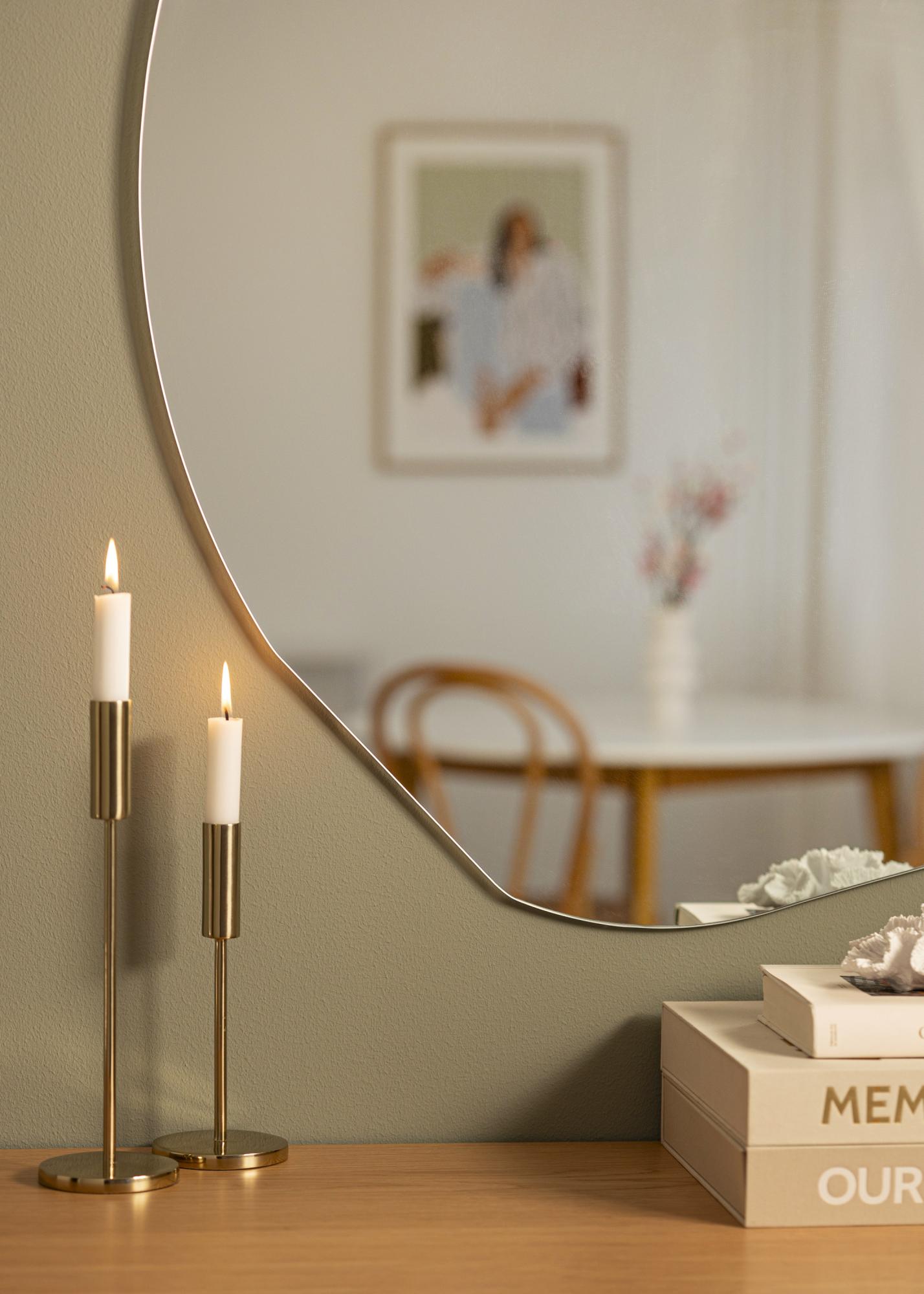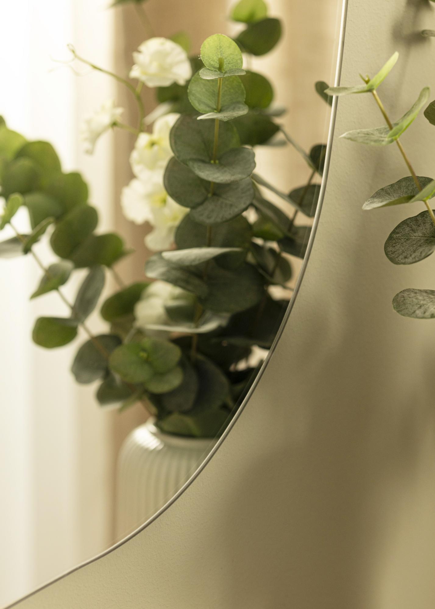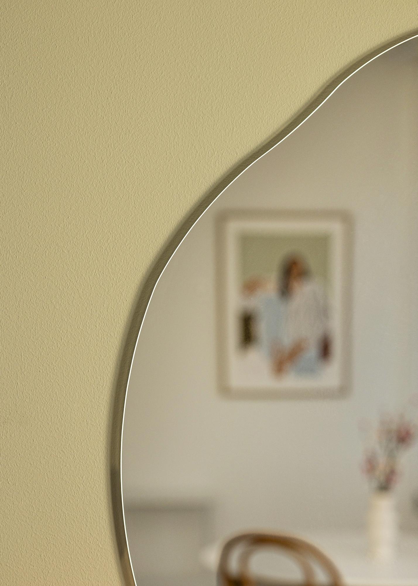 Der Spiegel hat eine abgerundete, fast organische Form mit weichen, fließenden Linien, die eine entspannte und einladende Atmosphäre schaffen. Dieses Design macht den Spiegel zu einem natürlichen Blickfang im Raum und verleiht Ihrer Einrichtung einen Hauch von Eleganz und Sanftheit.