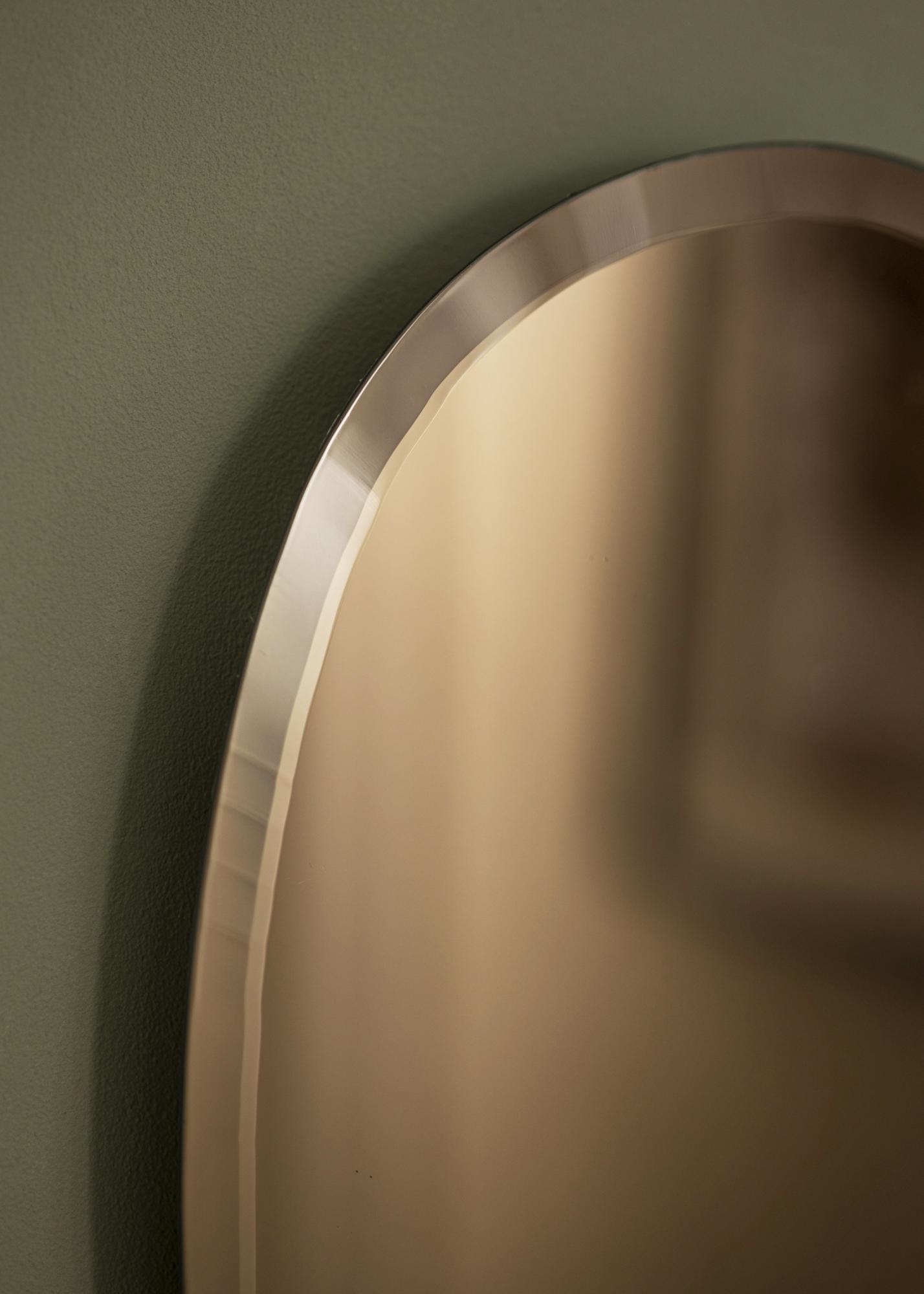 Dieser Spiegel hat eine markante und fließende Form, die ein organisches Gefühl ausstrahlt und ihn zu einem auffälligen Akzent im Raum macht. Das bronzefarbene Spiegelglas verleiht ihm einen warmen und einladenden Glanz und sorgt für einen Hauch von Retro-Charme, ohne dabei den umgebenden Raum zu überwältigen.