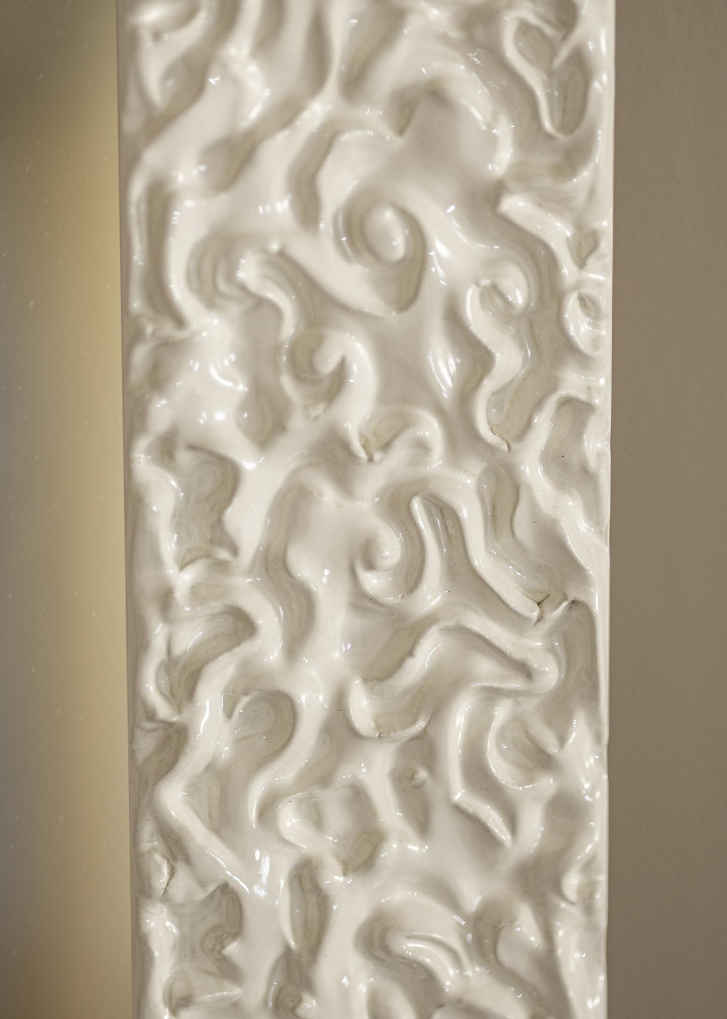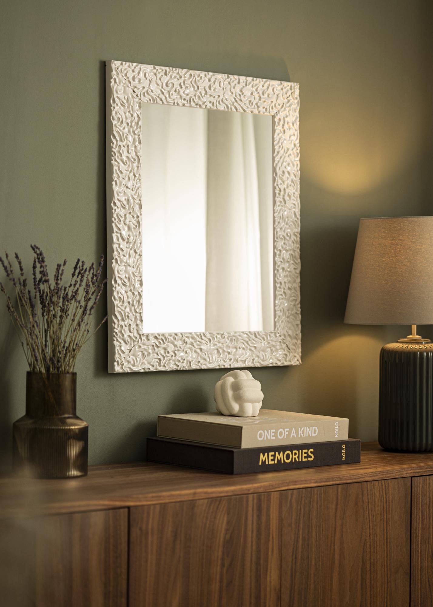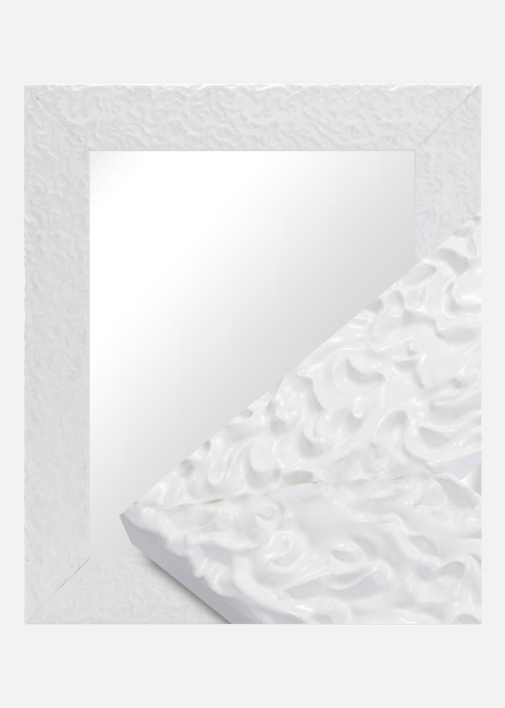 Die hochglänzende weiße Oberfläche des Spiegels hat ein lebendiges, organisches Muster, das ein modernes und elegantes Gefühl schafft. Diese glänzende Oberfläche verstärkt die weichen, fließenden Formen und verleiht dem Rahmen einen exklusiven Ausdruck. Es ist die perfekte Lösung für Sie, die ein auffälliges Detail suchen, das klassische Inspiration mit einem zeitgenössischen Design kombiniert.