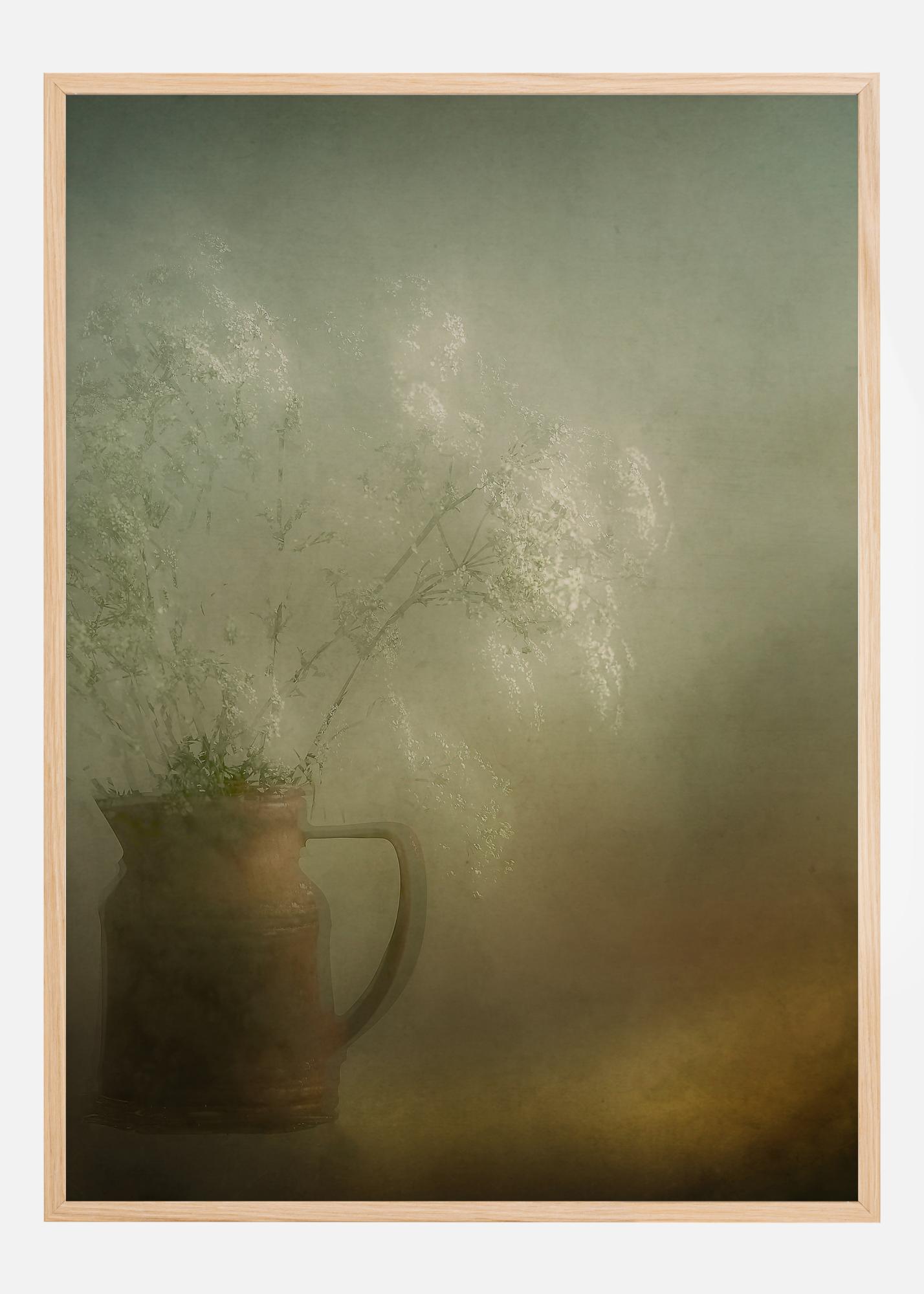 Ein malerisches Stillleben-Poster mit einem braunen Steingutkrug voller weicher, schwebender weißer Blumen. Dieser Frühlingsstrauß ist wolkenähnlich und verschwindet fast vor der weichen grauen Wand dahinter. Ein orangefarbener Schimmer sorgt für Wärme am unteren Rand des Bildes, wo der Krug steht.