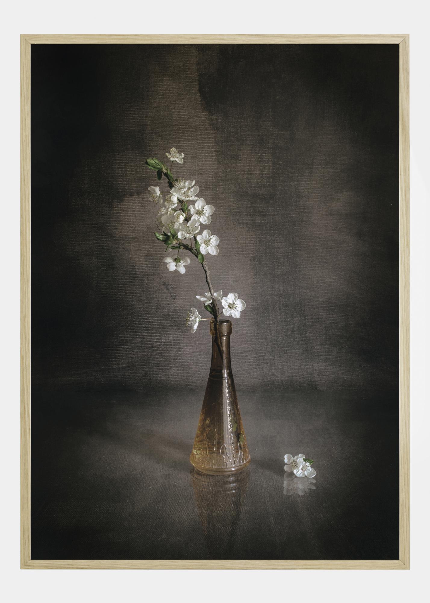 Ein Frühlingsposter mit weißen Blumen in einer dünnen braunen Vase. Die Vase wirft Schatten in zwei Richtungen, wodurch ein heller Brennpunkt entsteht, an dem sich die sternförmigen Blumen von den dunkelbraunen, breiten Pinselstrichen der Wand dahinter abheben. Betrachten Sie dieses elegante frühlingshafte Stillleben.
