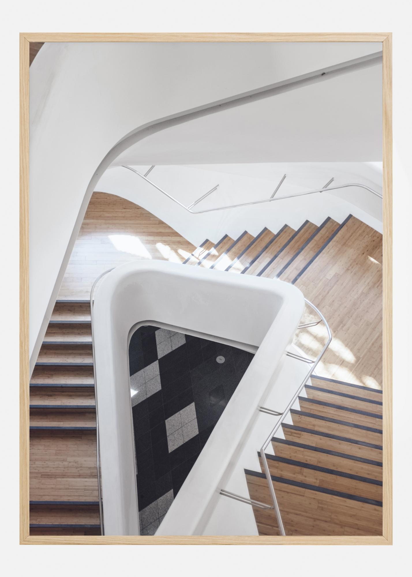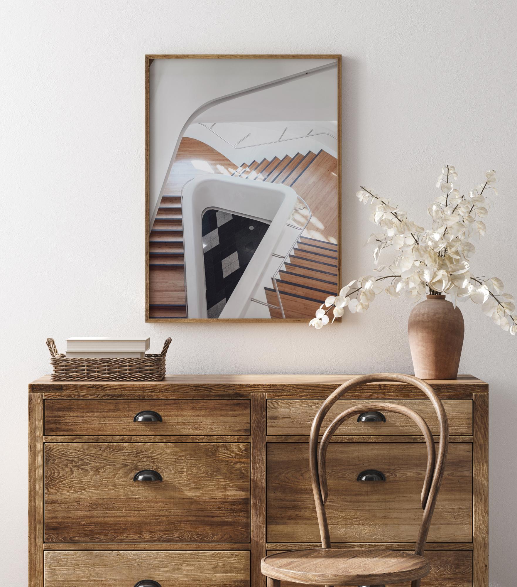 Ein Poster für Innenräume, das eine Treppe in Form eines Dreiecks zeigt. Die Stufen sind braun, die Wände und das Geländer sind weiß und mit Chromleisten versehen. Die Treppe führt in einer Kurve nach unten und mündet in einen schwarz-weiß gefliesten Boden. Schauen Sie in diesem Escher-ähnlichen Bild von oben herab und stellen Sie sich vor, wie Sie diese hübschen Stufen überqueren.