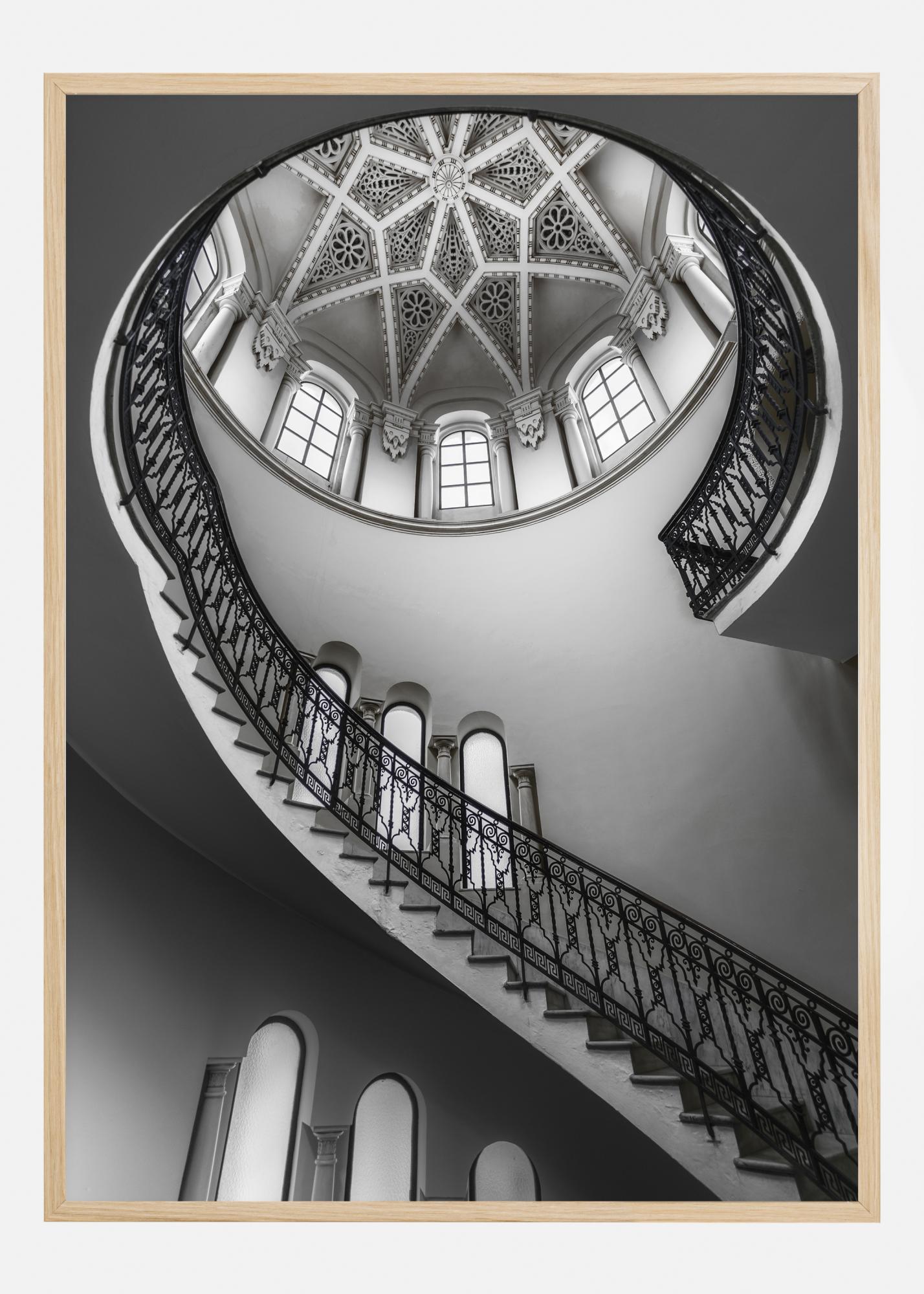 Ein kompliziertes Poster des Inneren eines Gebäudes. Eine Wendeltreppe mit kunstvollen schmiedeeisernen Geländern windet sich zur Decke hinauf. Der Blick wird auf die Kuppel mit dem beeindruckenden Gitterwerk und den hellen Fenstern gelenkt, durch die das Licht einfällt. Eleganz und Detailreichtum verbinden sich in diesem Schwarz-Weiß-Bild.