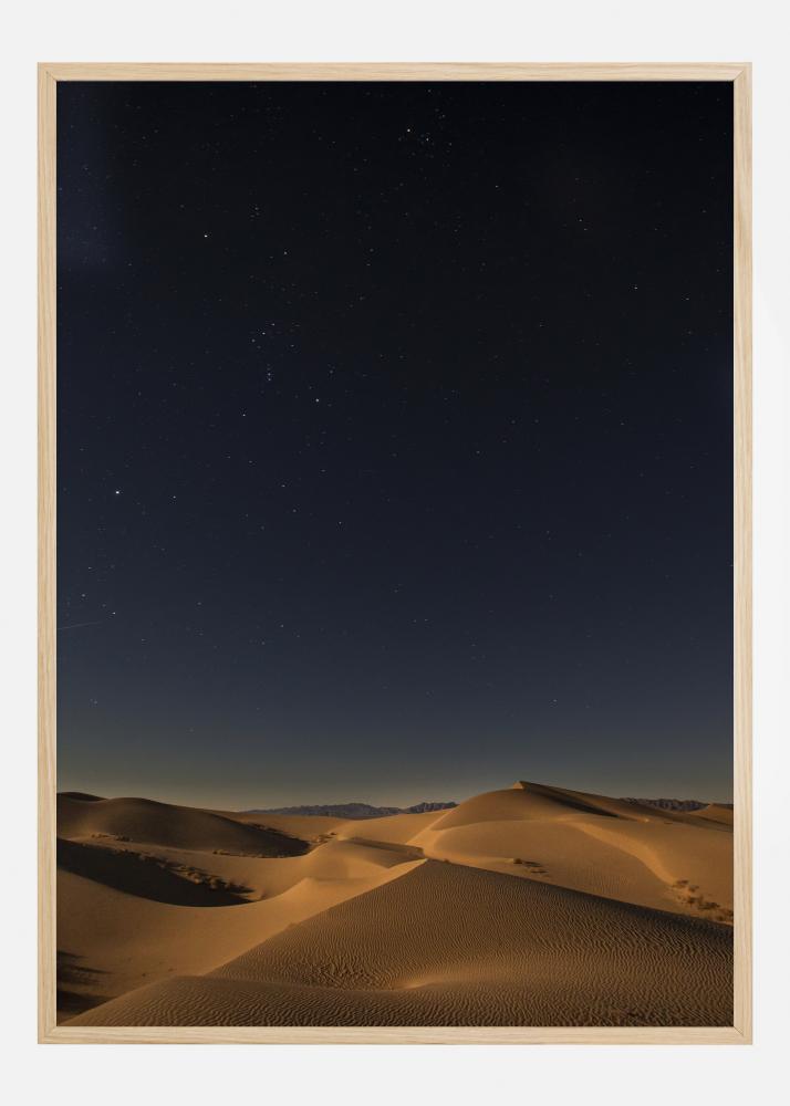 Ein stimmungsvolles Poster der Wüste bei Nacht. Weiche, goldgelbe Dünen erstrecken sich am unteren Rand des Bildes in die Ferne. Über dem Sand erstreckt sich eine enorme Weite des dunkelblauen Himmels mit zarten Sternen. Schaffen Sie ein Gefühl der Weite, wenn Sie dieses Bild mit nach Hause nehmen.