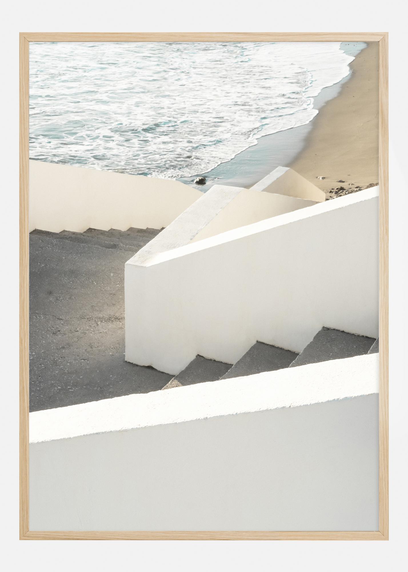 Dieses Poster vermittelt sowohl ein Gefühl von Architektur als auch von Natur, indem es eine verwitterte Treppenstruktur zeigt, die zu einem friedlichen Strand und dem ruhigen Meer hinunterführt. Das Spiel zwischen Licht und Schatten auf den Stufen, zusammen mit dem Kontrast zwischen der strengen Architektur und der weichen Küstenlinie, schafft ein Bild, das sowohl beruhigend als auch visuell interessant ist.